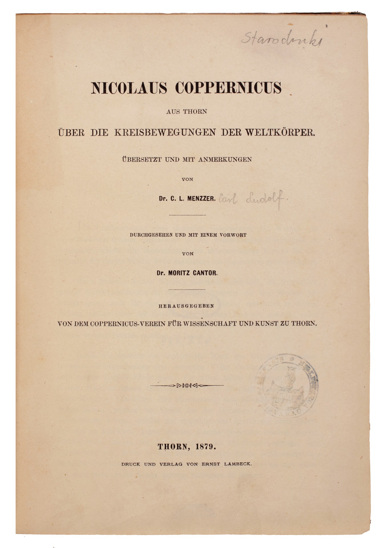 Part of Nicolaus Coppernicus aus Thorn, Über die Kreisbewegungen der Weltkörper, übersetzt und mit Anmerkungen von Carl Ludolf Menzzer