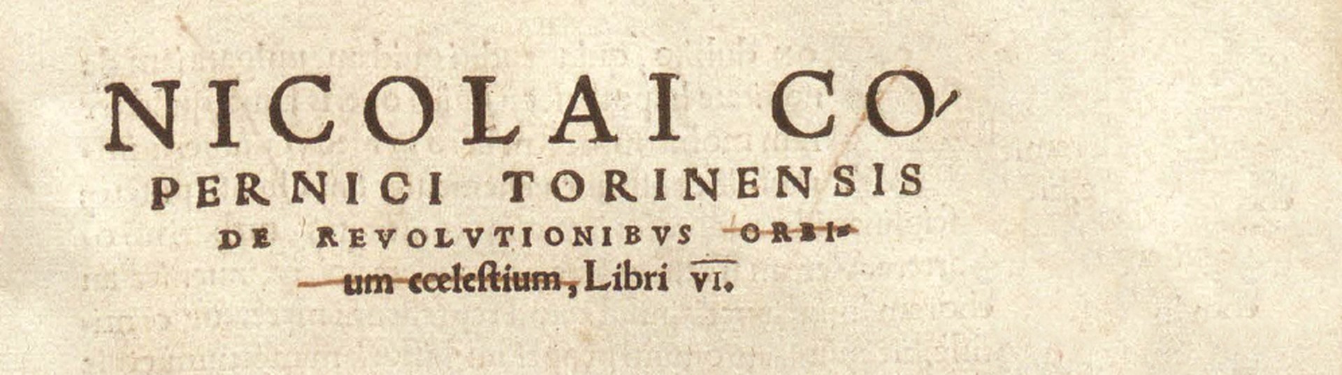 Fragment karty tytułowej pierwszego wydania De revolutionibus z przekreślonymi ręką właściciela książki Johannesa Aurifabra słowami „orbium coelestium” w egzemplarzu z Biblioteki Kórnickiej, sygn. Cim. F. 4072