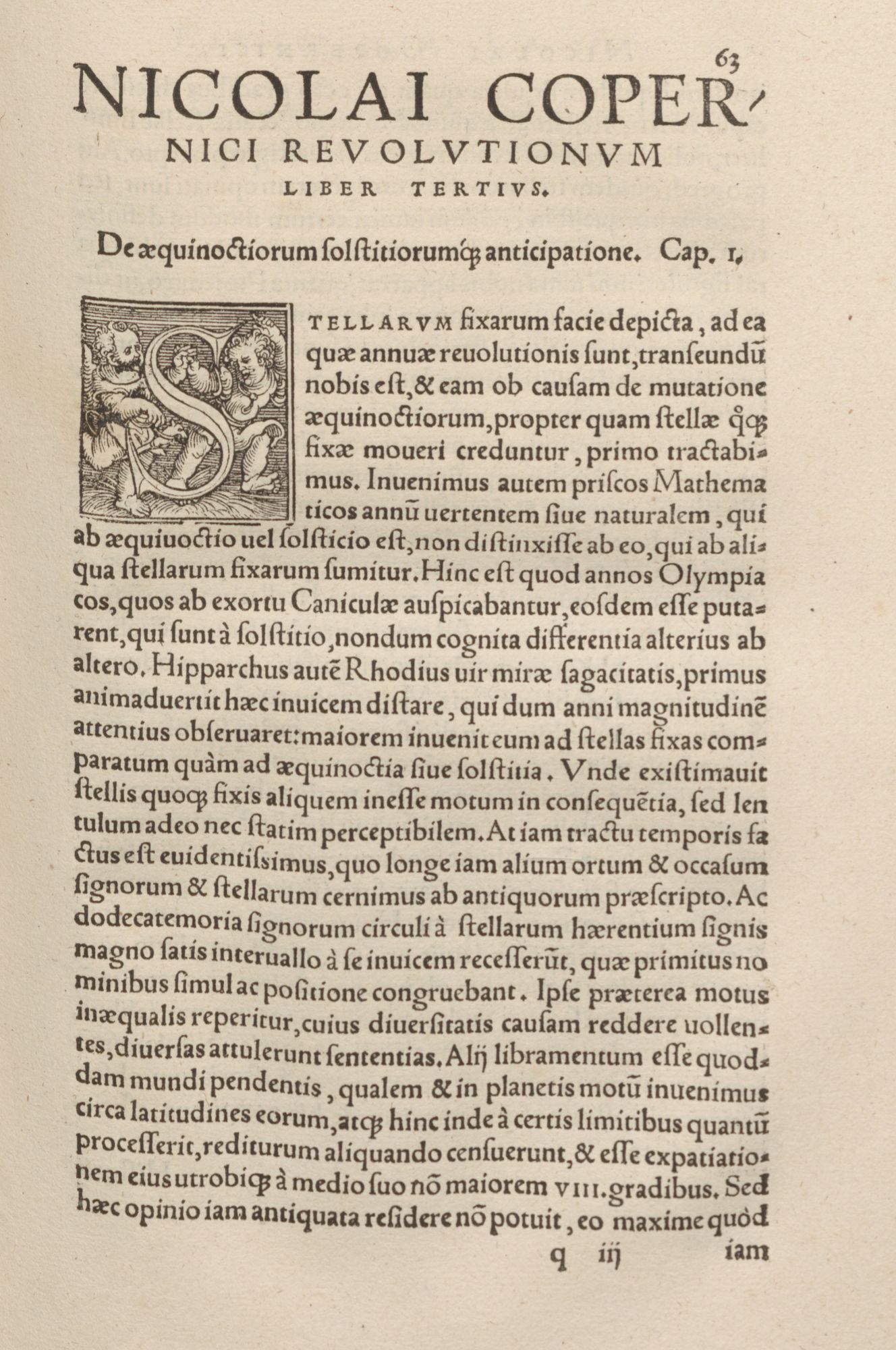 Pierwsza karta z księgi trzeciej pierwszego wydania De revolutionibus Mikołaja Kopernika; Biblioteka im. Zielińskich Towarzystwa Naukowego Płockiego, sygn. XVI, 170; k. 63