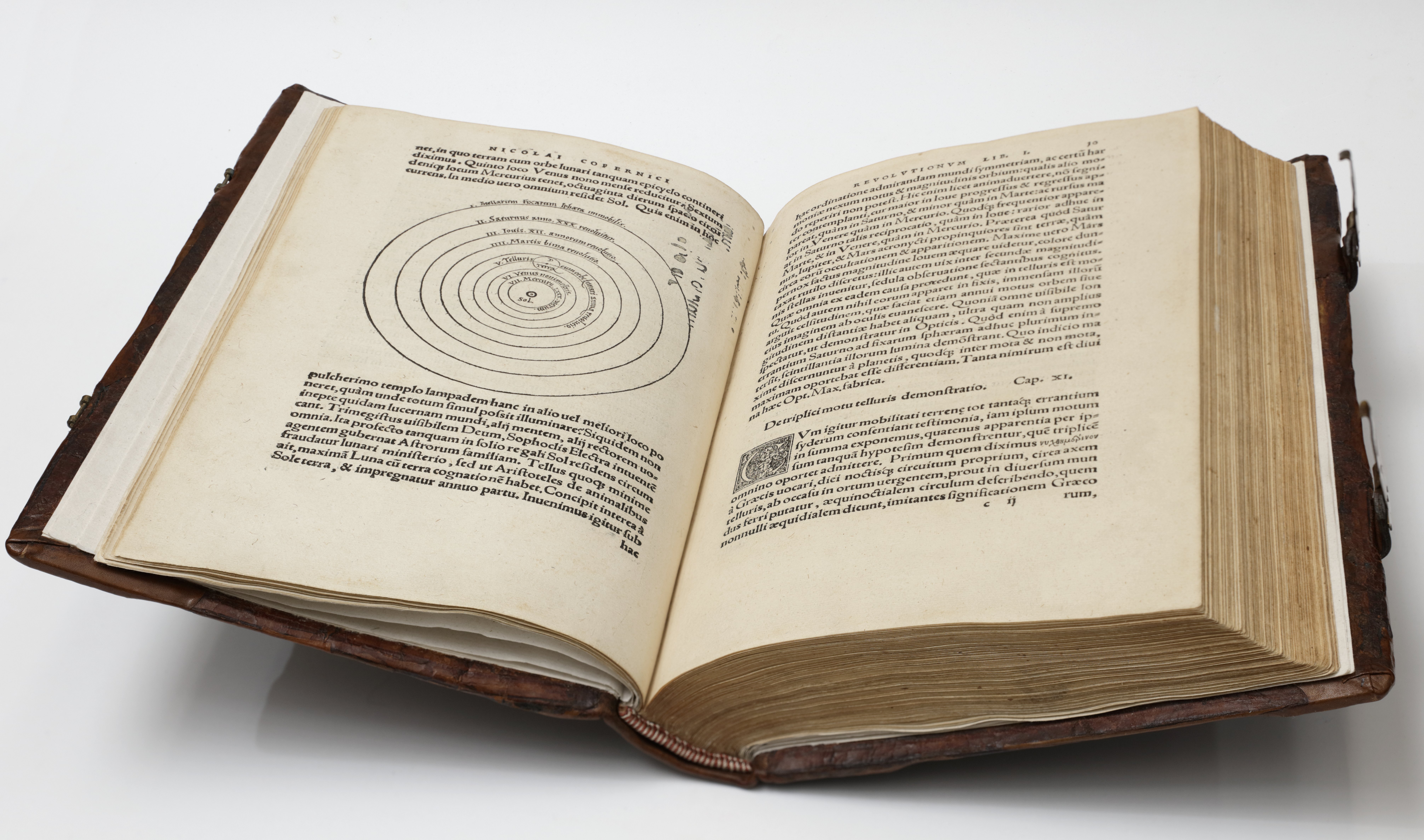 Part of Nicolai Copernici Torinensis De Revolvtionibvs Orbium coelestium, Libri VI. Habes in hoc opere iam recens nato, [et] aedito, studiose lector, Motus stellarum, tam fixarum, quam erraticarum, cum ex ueteribus, tum etiam ex recentibus obseruationibus restitutos: [et] nouis insuper ac admirabilibus hypothesibus ornatos. Habes etiam Tabulas expeditissimas, ex quibus eosdem ad quoduis tempus quam facillime calculare poteris. Igitur eme, lege, fruere.