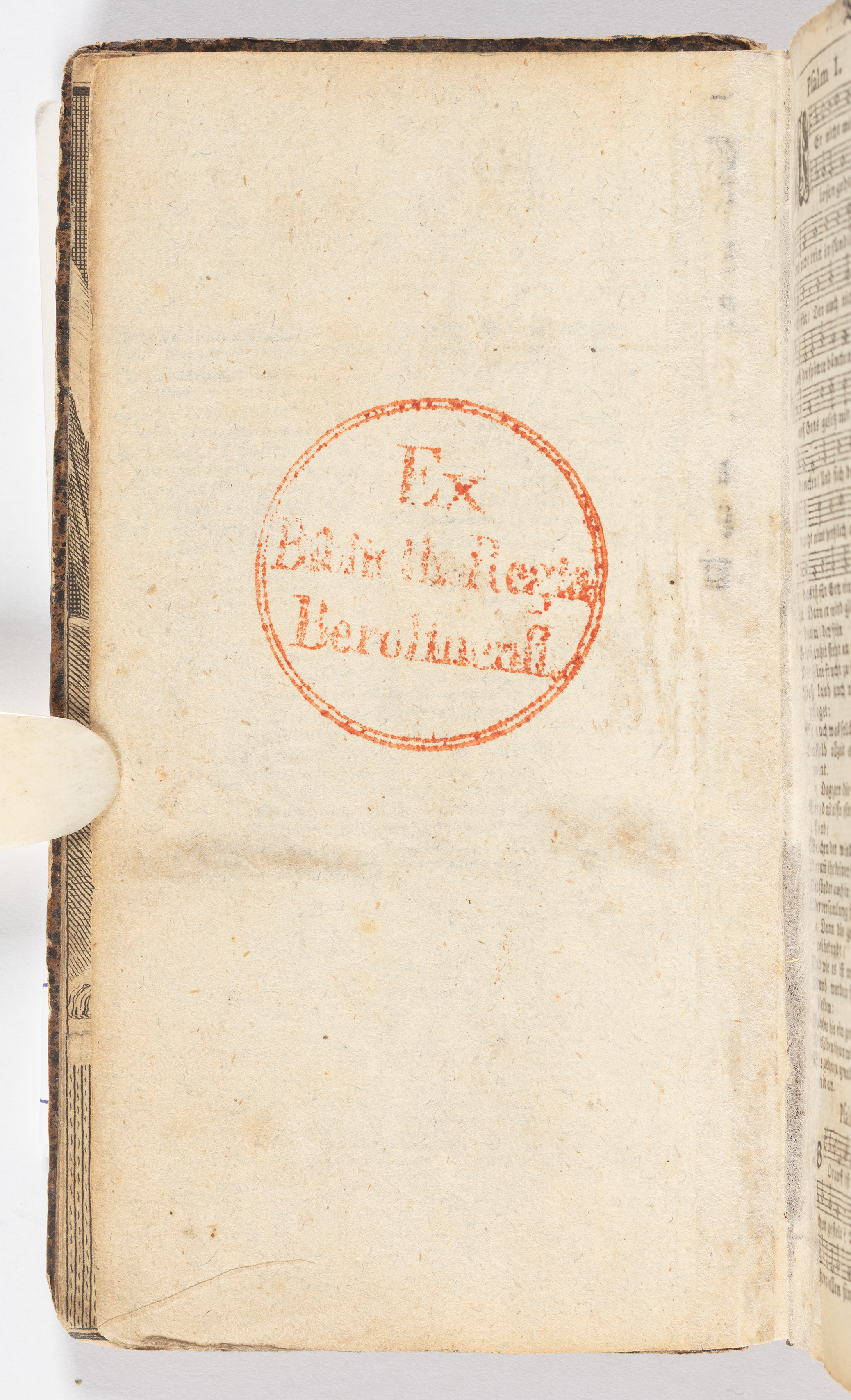 Die Psalmen Davids Nach Frantzzoesischer Melodey in Teutsche reymen gebracht Durch D. Ambrosium Lobwasser... - verso karty tytułowej, duża czerwona okrągła pięczęć: „Ex Biblioth. Regia Berolinensi”