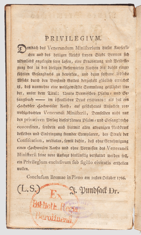 Part of Neues Bremisches Psalm und Gesangbuch : zur öffentlichen und besonderen Erbauung der Reformiten Stadt: und Landemainen, mit Hoch Obrigkeitlicher Bewilligung harausgebenoven dem Bremischen Ministerio