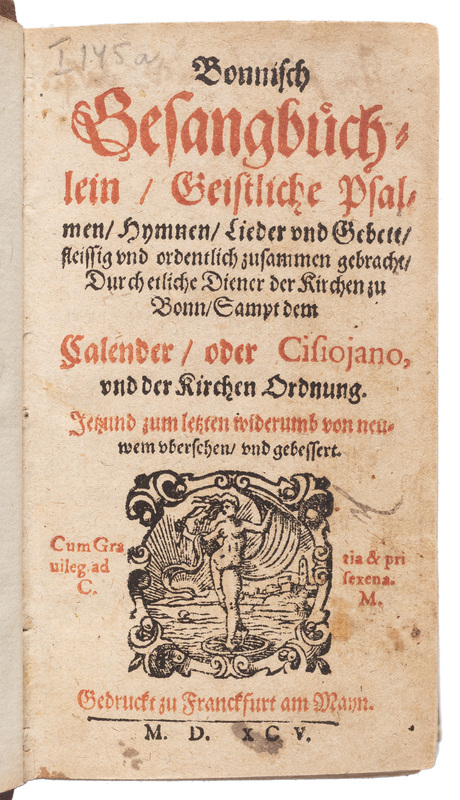Part of Bonnish Gesangbuechlein Geistliche Psalmen Hymnen Lieder vnd Gebett fleissig vnd ordentlich zusammen gebracht Durch etliche Diener der Kirchen zu Bonn