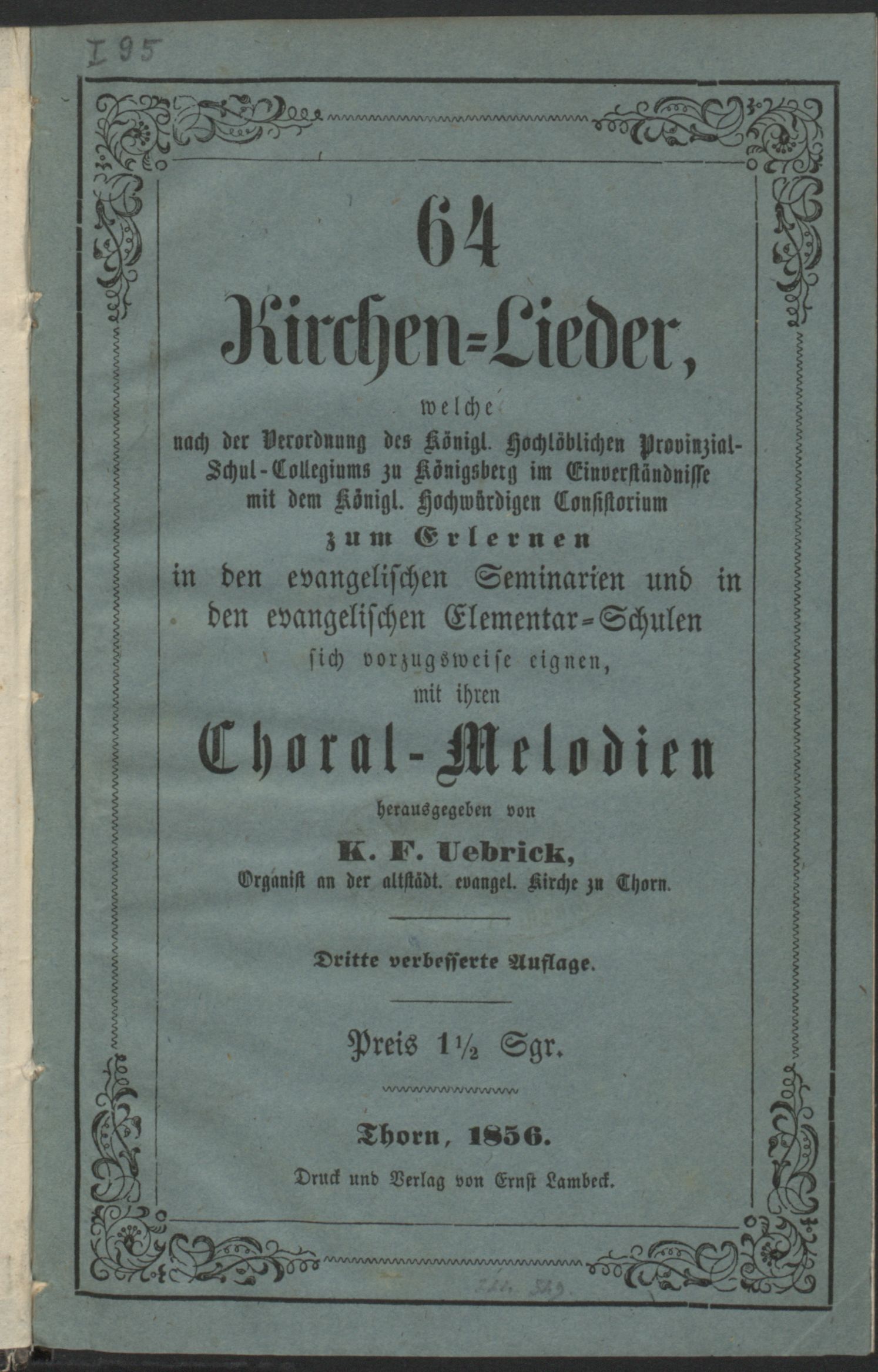 Part of 64 Kirchen-Lieder, welche nach der Verordnng des Königl. Hochlöblichen Provinzial - Schul - Collegiums zu Königsberg im Einverständnisse mit dem Königl. Hochwürdigen Consistorium zum erlernen in den evangelischen Seminarien und in den evangelischen Elementar=Schulen sich vorzugsweise eignen: mit ihren Choral-Melodien