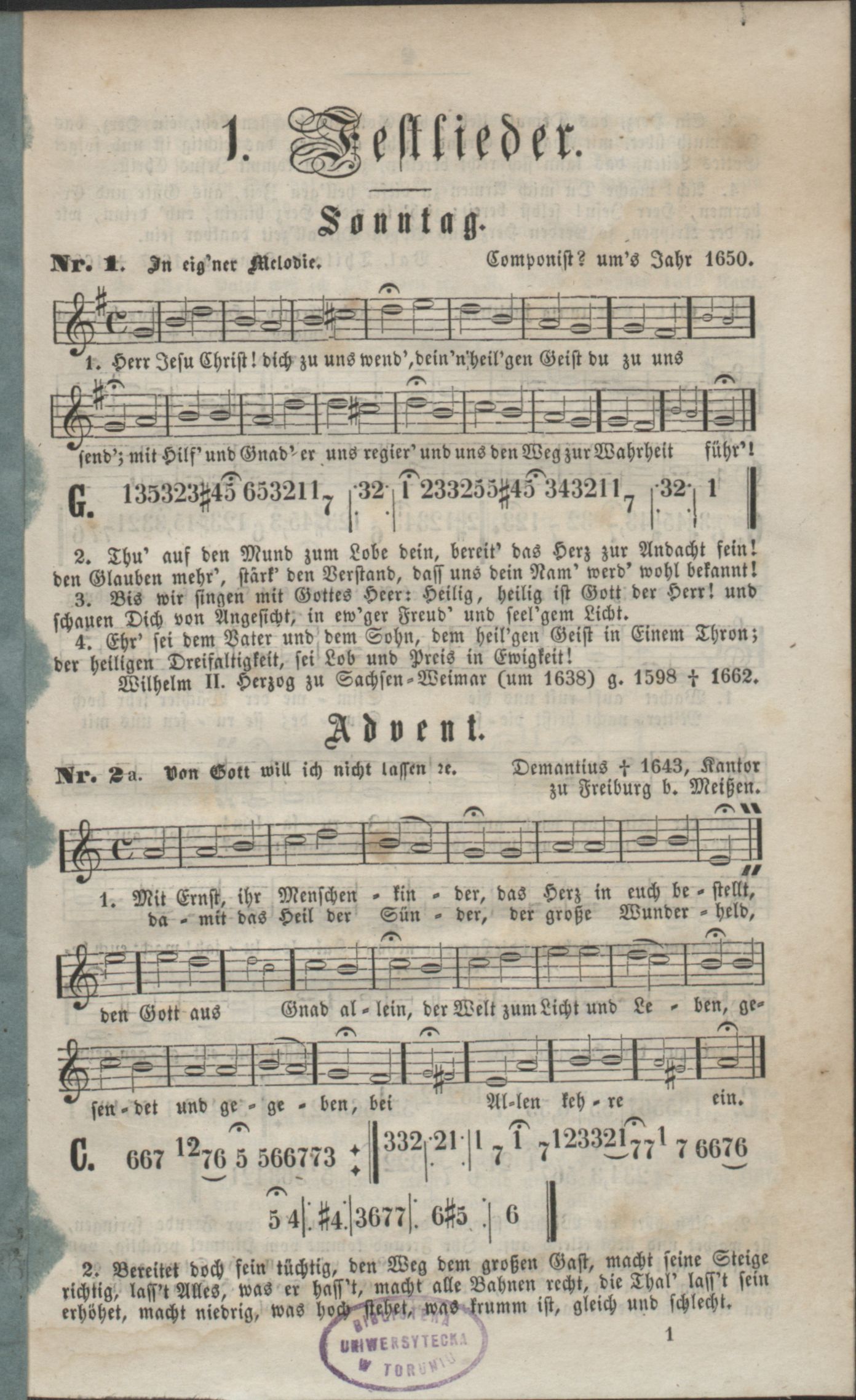 Part of 64 Kirchen-Lieder, welche nach der Verordnng des Königl. Hochlöblichen Provinzial - Schul - Collegiums zu Königsberg im Einverständnisse mit dem Königl. Hochwürdigen Consistorium zum erlernen in den evangelischen Seminarien und in den evangelischen Elementar=Schulen sich vorzugsweise eignen: mit ihren Choral-Melodien