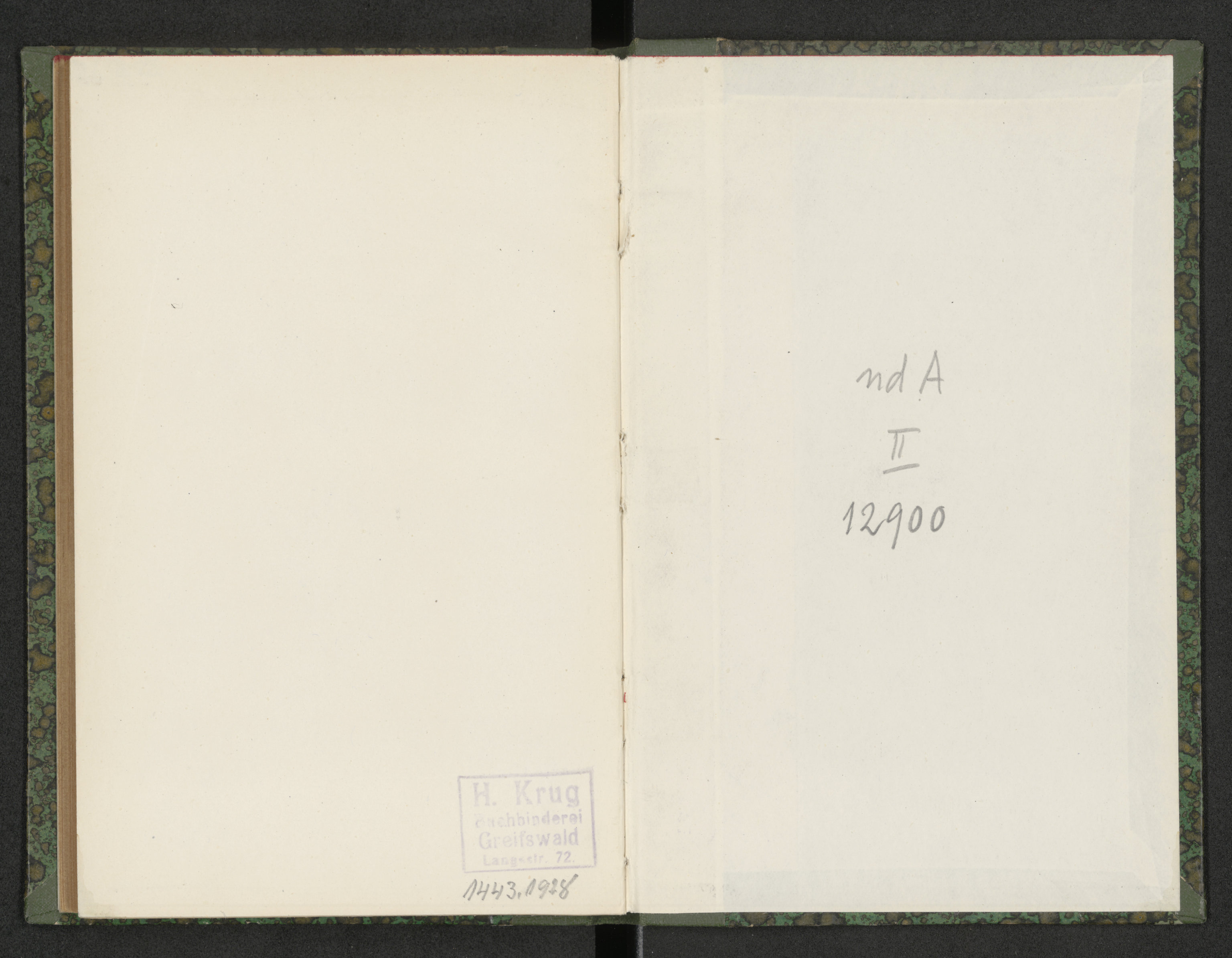 Schleswig-Holsteinisches Liederbuch - wyklejka tylnej okładziny i sasiadujaca strona z pieczatką - pieczątka prostokątna: H. Krug Buchhinderei Greiswald Langestr. 72