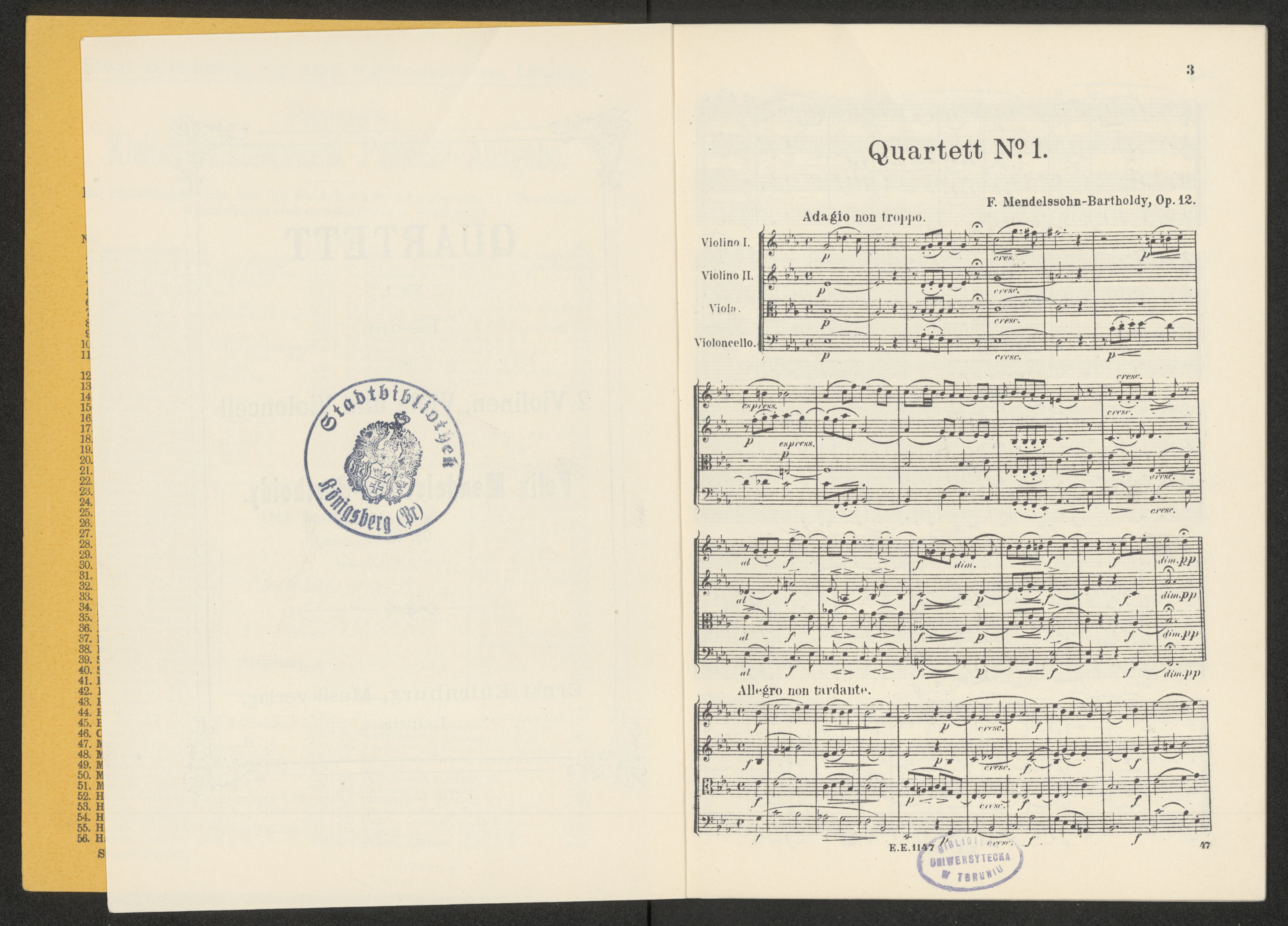 Part of Quartet No. 1 Es-dur für 2 Violinen, Viola und Violoncell