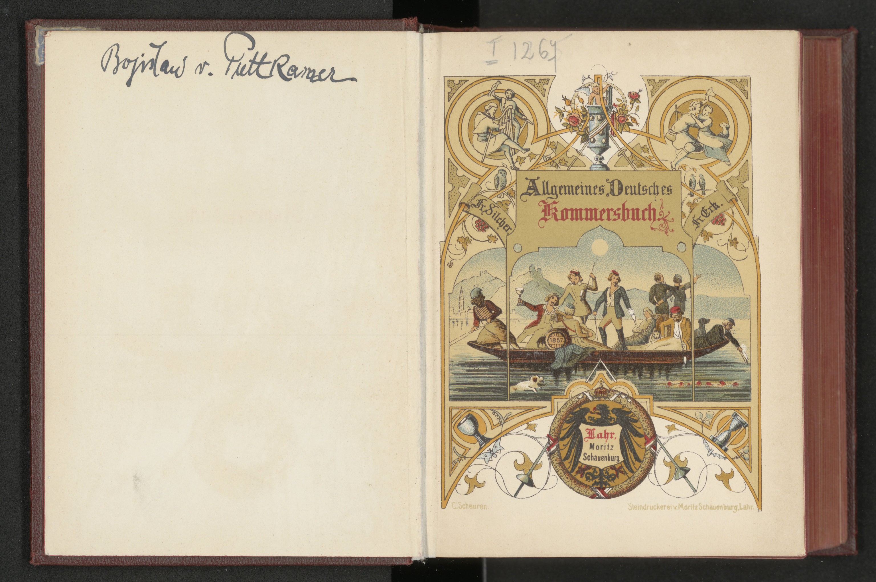 Allgemeines Deutsches Kommersbuch - karta przytytułowa verso z zapiskiem własnościowym / karta kolorowa z frontyspisem