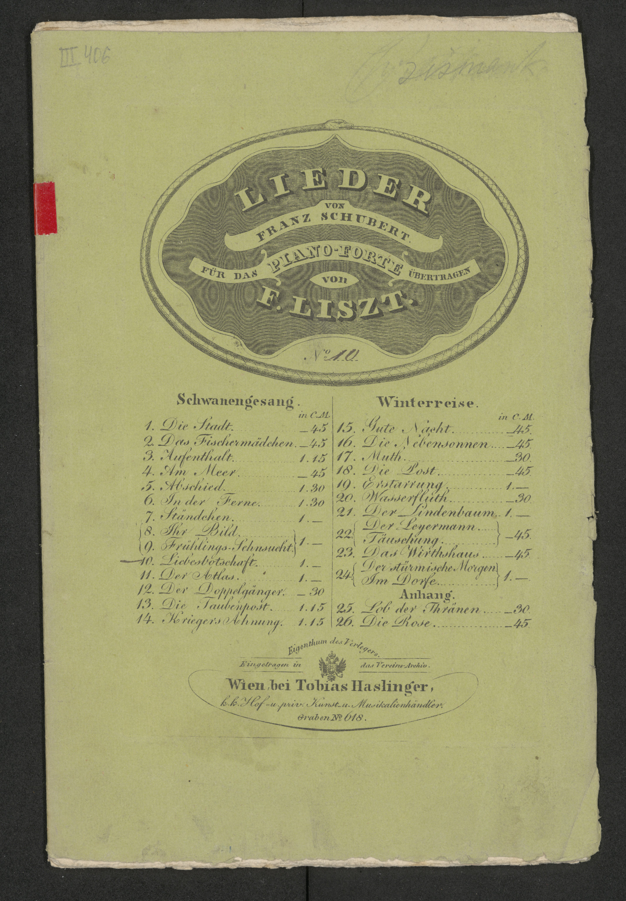 Liebesbotschaft. Lied aus Fr. Schubert's Schwanengesang für das Piano-Forte - okładka przednia z ołówkowym podpisem