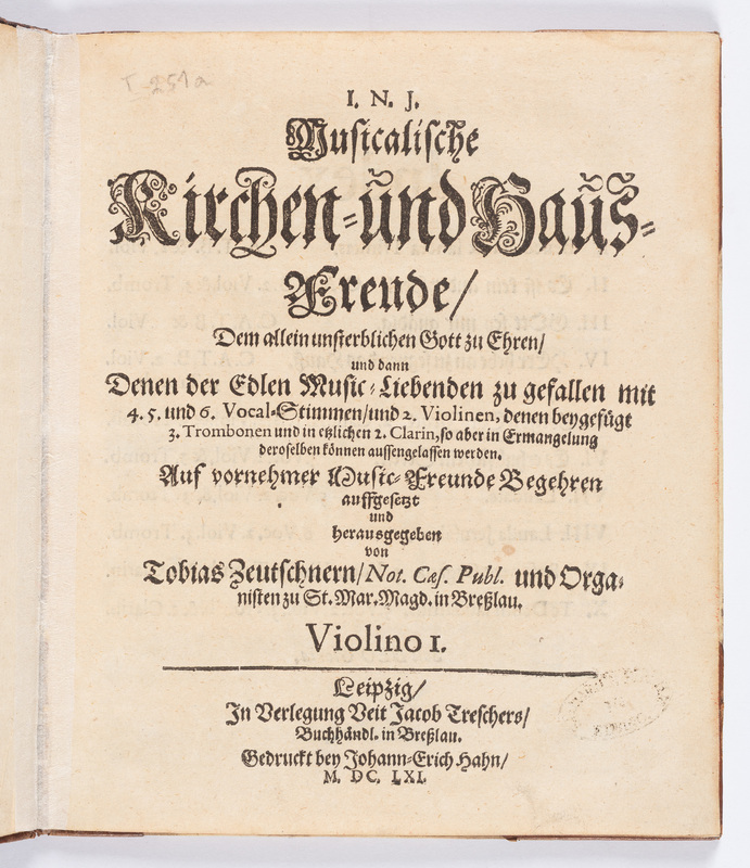 Part of [I.N.J.] Musicalische Kirchen und haus-freude Dem allein unsterblichen Gott zu Ehren un dann Denen der Edlen Music Liebenden zu gefallen mit 4. 5. und 6. Vocal Stimmen und 2. Violinen, denen beygefügt 3. Trombonen und in etzlichen 2. Clarin, so aber in Zeutschner Tobias