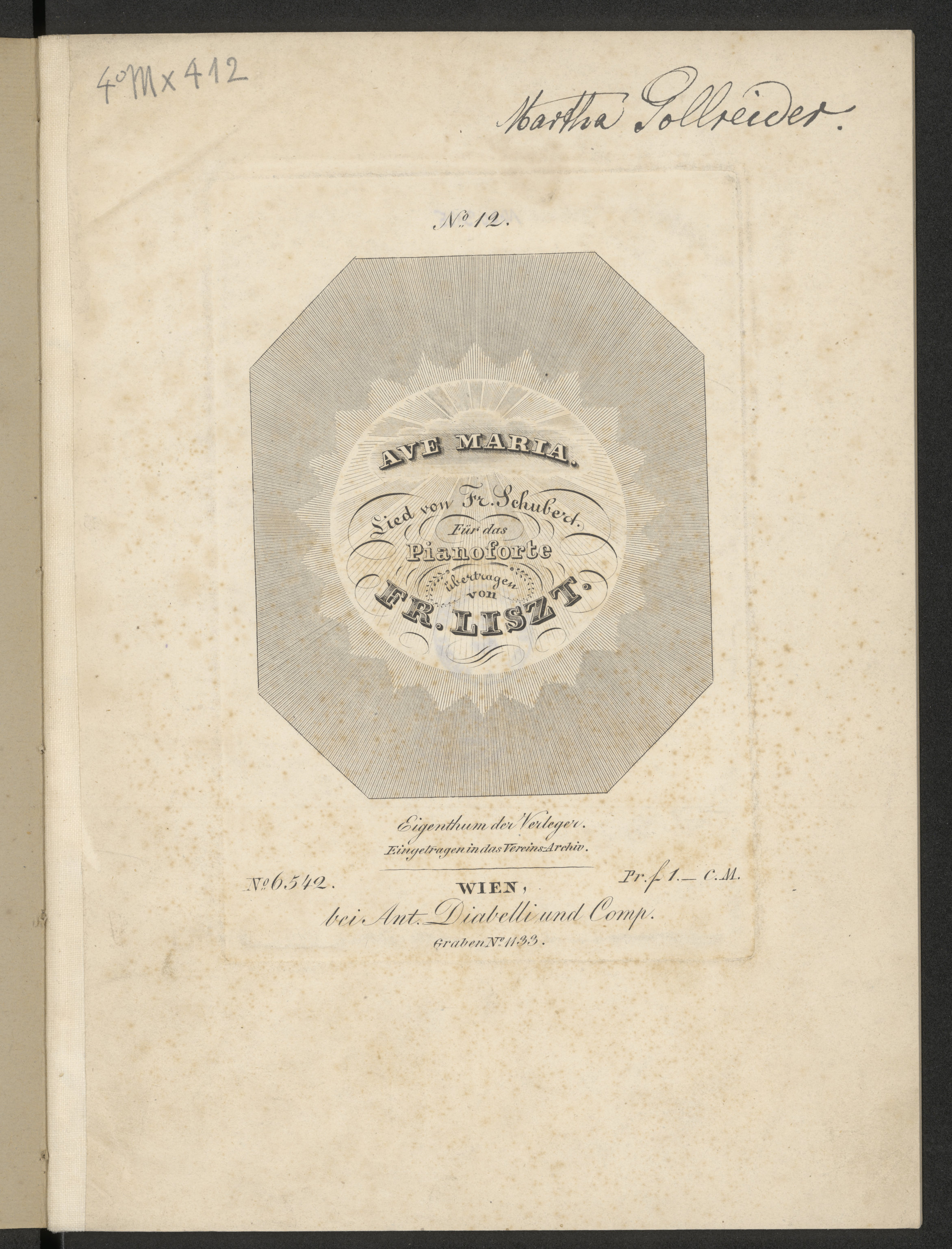 Ave Maria. Lied von Fr. Schubert für das Piano Forte - karta tytułowa recto - sygnatura ołówkowa Mx 412 - rękopiśmienny podpis: [Martha Pollreider]