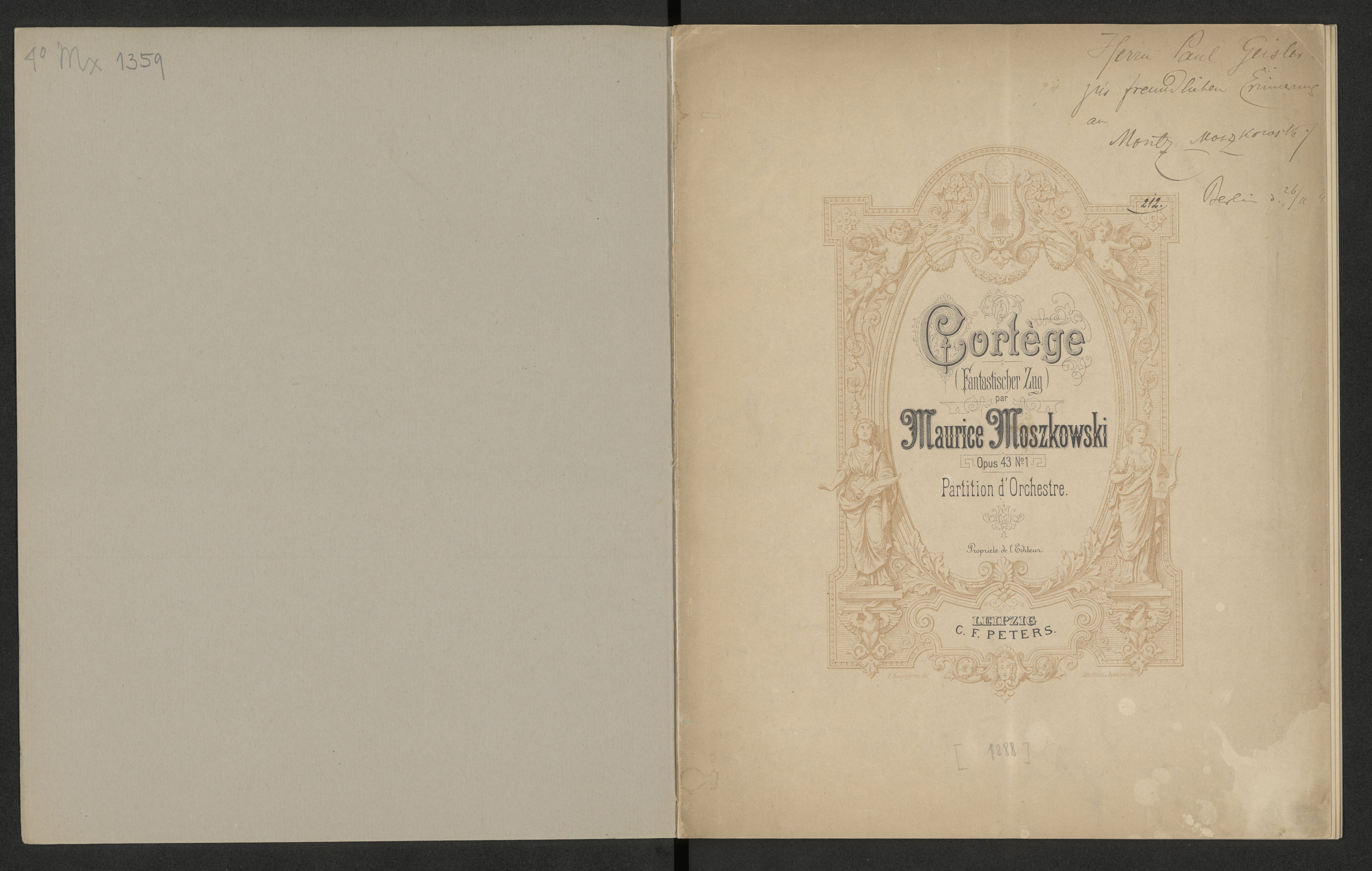 Cortège. Fantastischer Zug : op. 43 No 1 - strona tytułowa recto - rękopiśmienna dedykacja kompozytora: " Herrn Paul Geisler für freundlicher Erinerung am Moritz Moszkowski, Berlin d. 26/II9?"