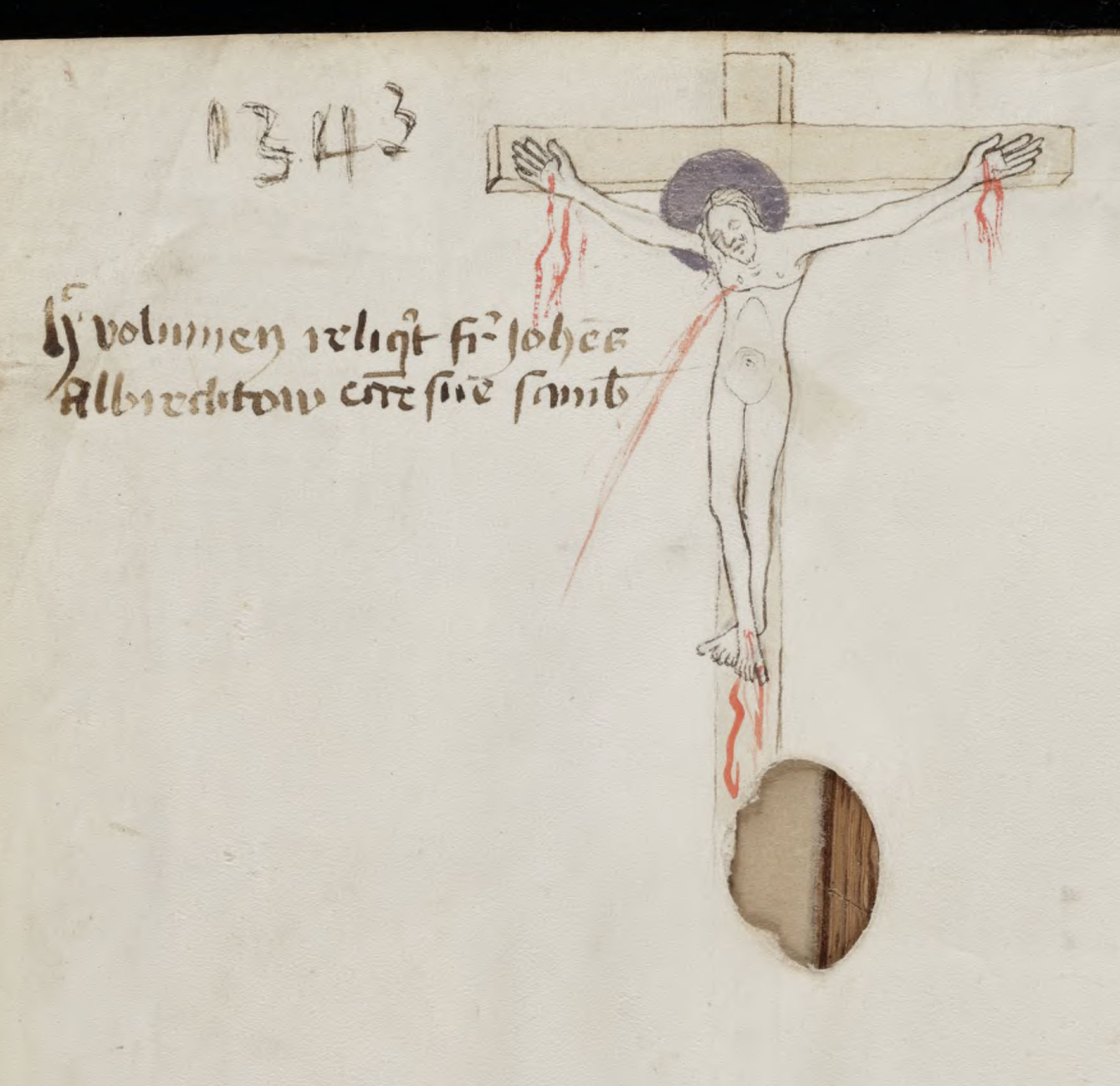 Zbiór traktatów z zakresu prawa kanonicznego, filozofii i teologii (m. in. Ioannes Beleth, Summa de ecclesiasticis officiis; Innocentius papa III, De sacro altaris mysterio; medytacje pasyjne) - nota: "Hoc volumen reliquit frater Johannes Albrechtow ecclesie sue Sambiensi" (na wyklejce górnej okładziny)