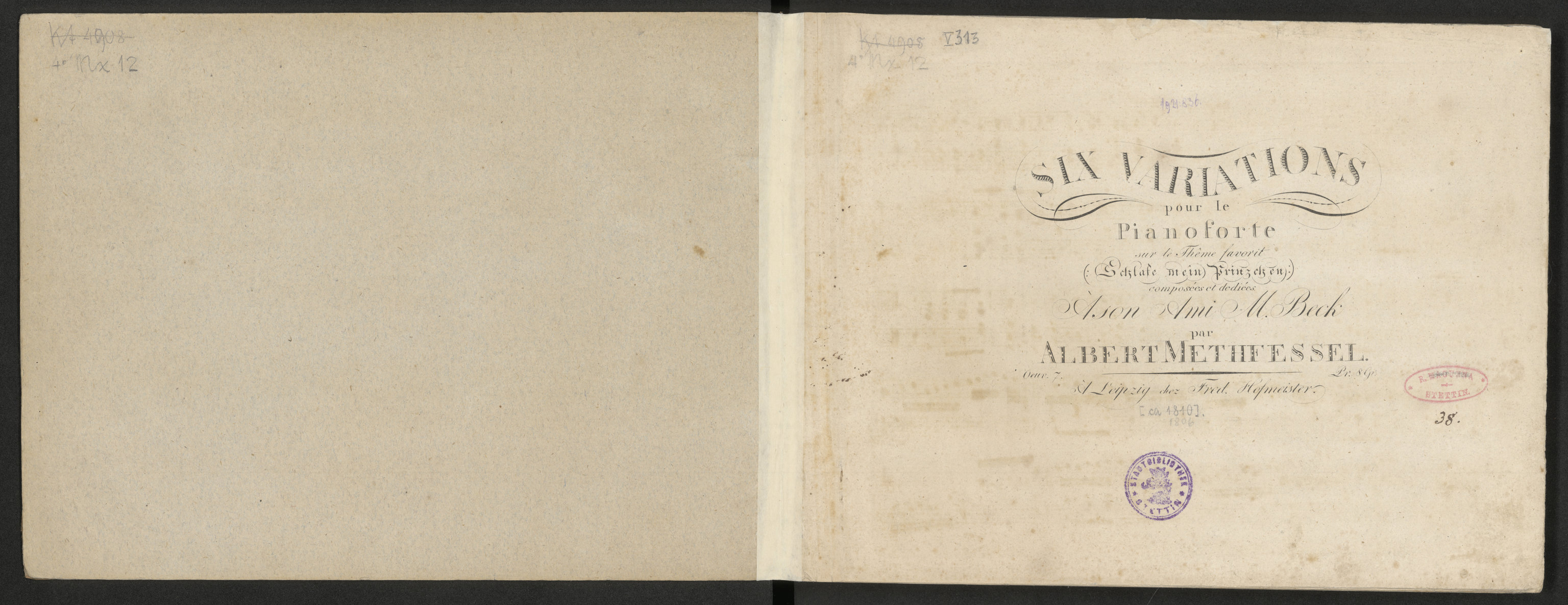 Six Variations pour le Pianoforte sur le Theme favorit (Schlafe meine Prinzchen) : composée et dediées Ason Ami M. Beck : op. 7 - okragła pieczątka: Stadtbibliothek Stettin; pieczątka owalna: R. MAGUNNA Stettin, rkp. 38,