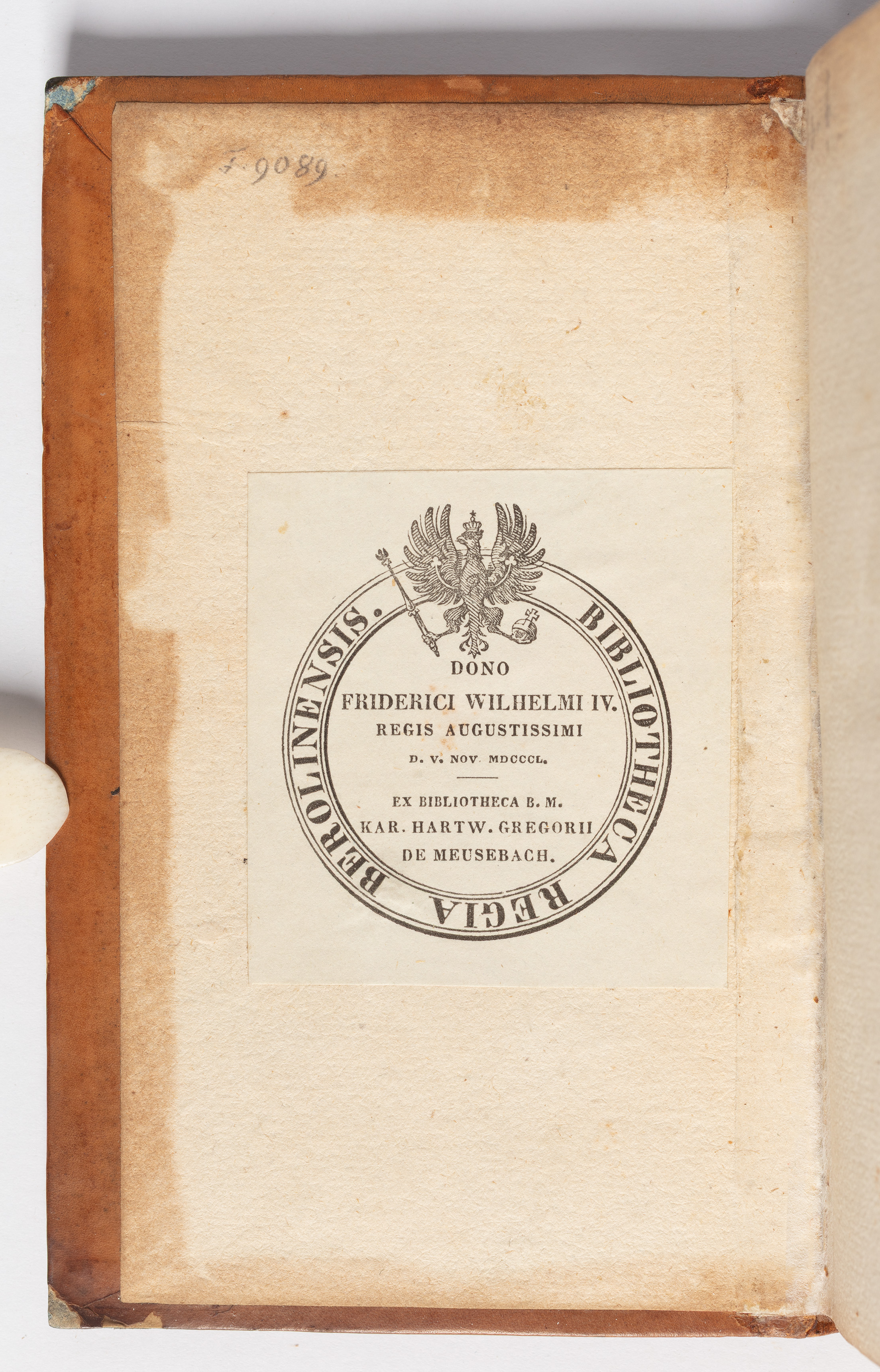 6. Ekslibris donacyjny "Bibliotheca Regia Berolinensis. Dono Friderici Wilhelmi IV Regis Augustissimi D. V. Nov. MDCCCL. Ex Bibliotheca B. M. Hartw. Gregorii De Meusebach"