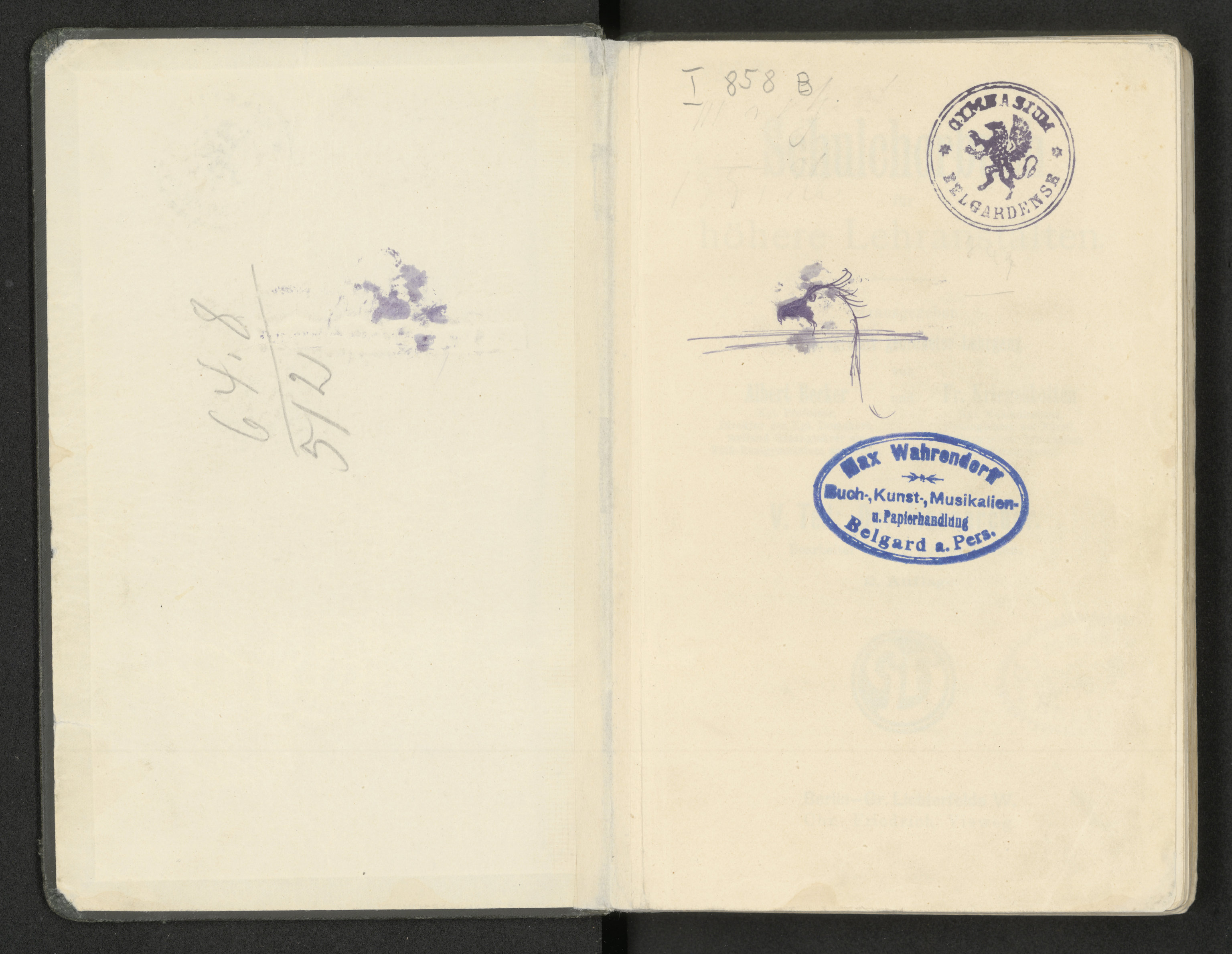 1. Pieczątka okrągła niebieska: w otoku nazwa instytucji GYMNASIUM BELGARDENSE, w centrum wizerunek pomorskiego gryfa