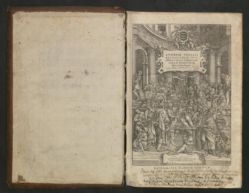 Andreae Vesalii Brvxellensis, Invictissimi Caroli V. Imperatoris medici, de Humani corporis fabrica Libri septem - strona tytułowa z okrągłą pieczątką: EX BIBLIOTHECA GYMNASII CULMENSIS