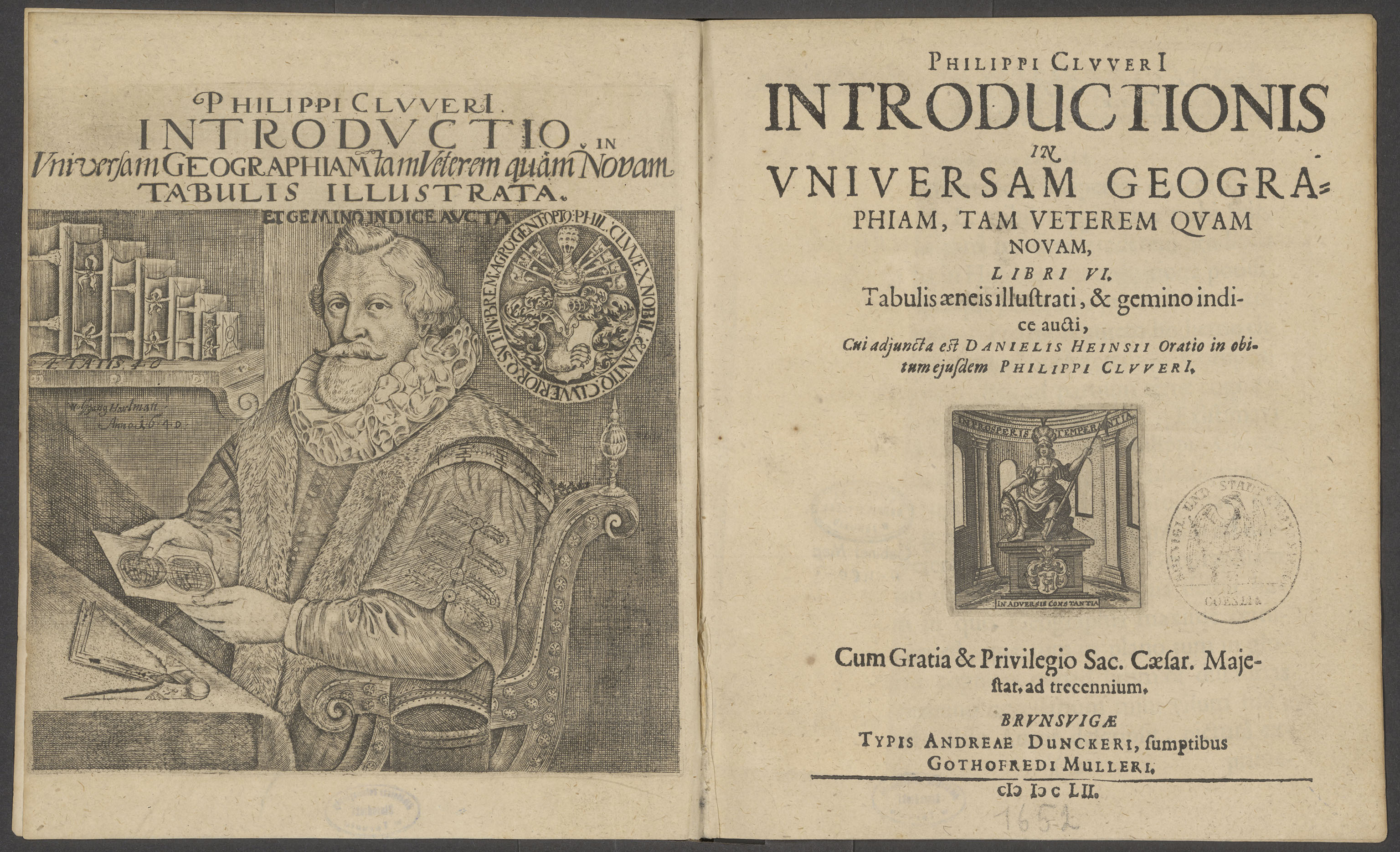 Philippi Clvveri[i] Introductionis In Vniversam Geographiam, Tam Veterem Qvam Novam, Libri VI. - strona z wizerukiem Philippa Clvveri i strona tytułowa z pieczątką: KOENIGL. UND STADT GYMNASIUM ZU COESLIN