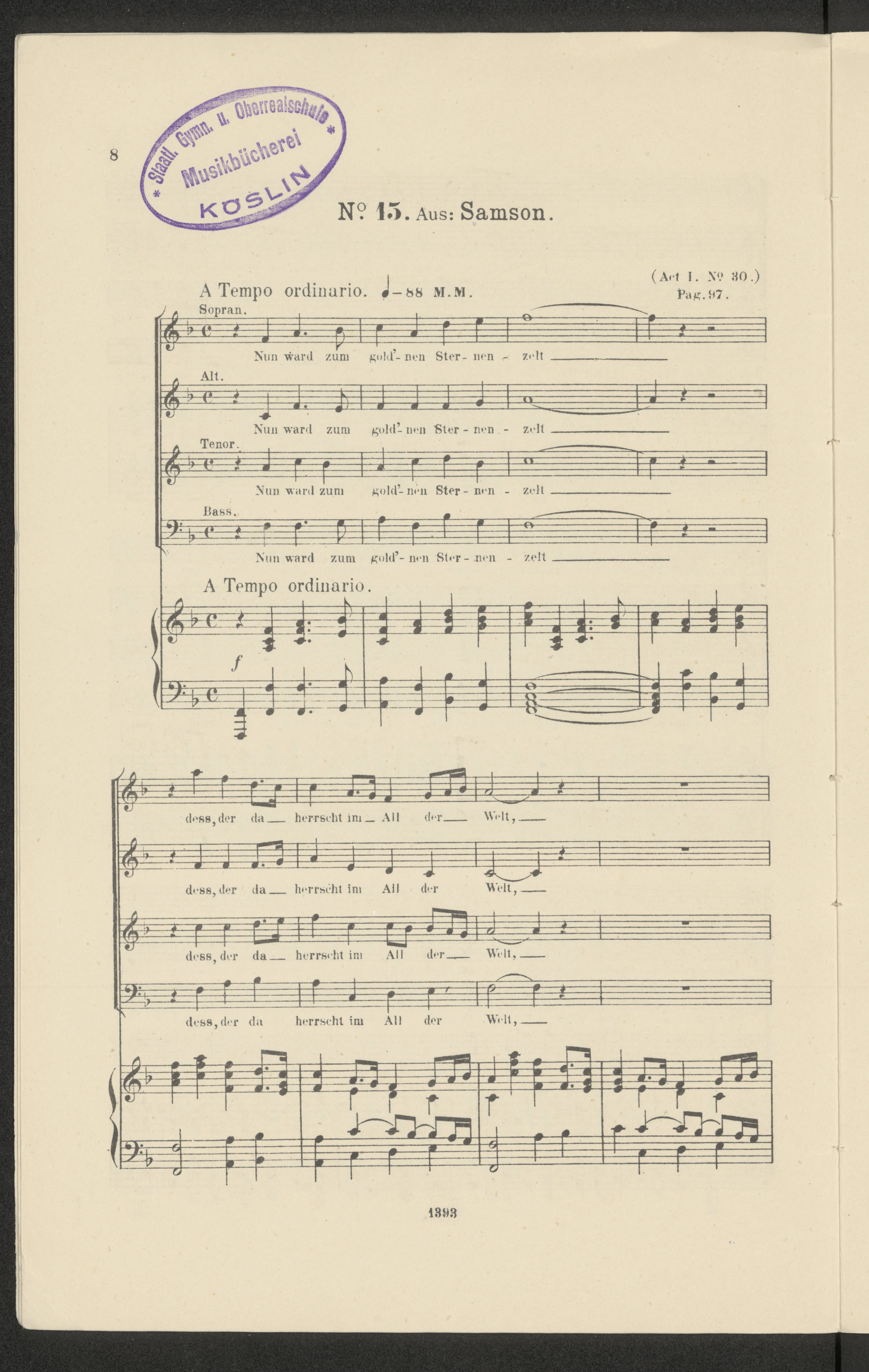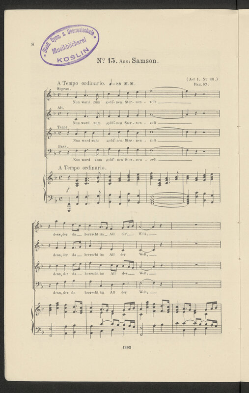 Gesänge für gemischten Chor mit Klavierbegleitung aus den Oratorien. [Lfg. 3] - strona 8 z owalna pieczatką fioletową: Staatl. Gymn. u. Oberrealschule Musikbücherei Köslin