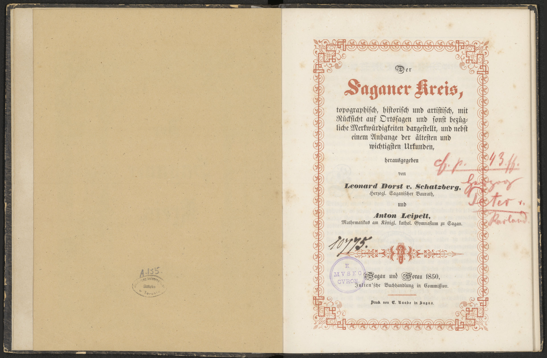 Part of Der Saganer Kreis, topographisch, historisch und artistisch, mit Rücksicht auf Ortssagen u. sonst bezügliche Merkwürdigkeiten dargestellt, u. nebst einem Anhange der ältester u. wichtigsten Urkunden