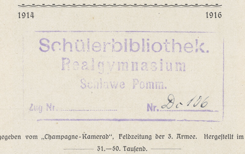 Anno Dazumal in der Chapagne. Erinnerungs-Blätter des Champagne-Soldaten, 1914-1916 - pieczątka kwadratowa: Schülerbibliothek Realgymnasium Schlawe Pomm z nr. sygnatury