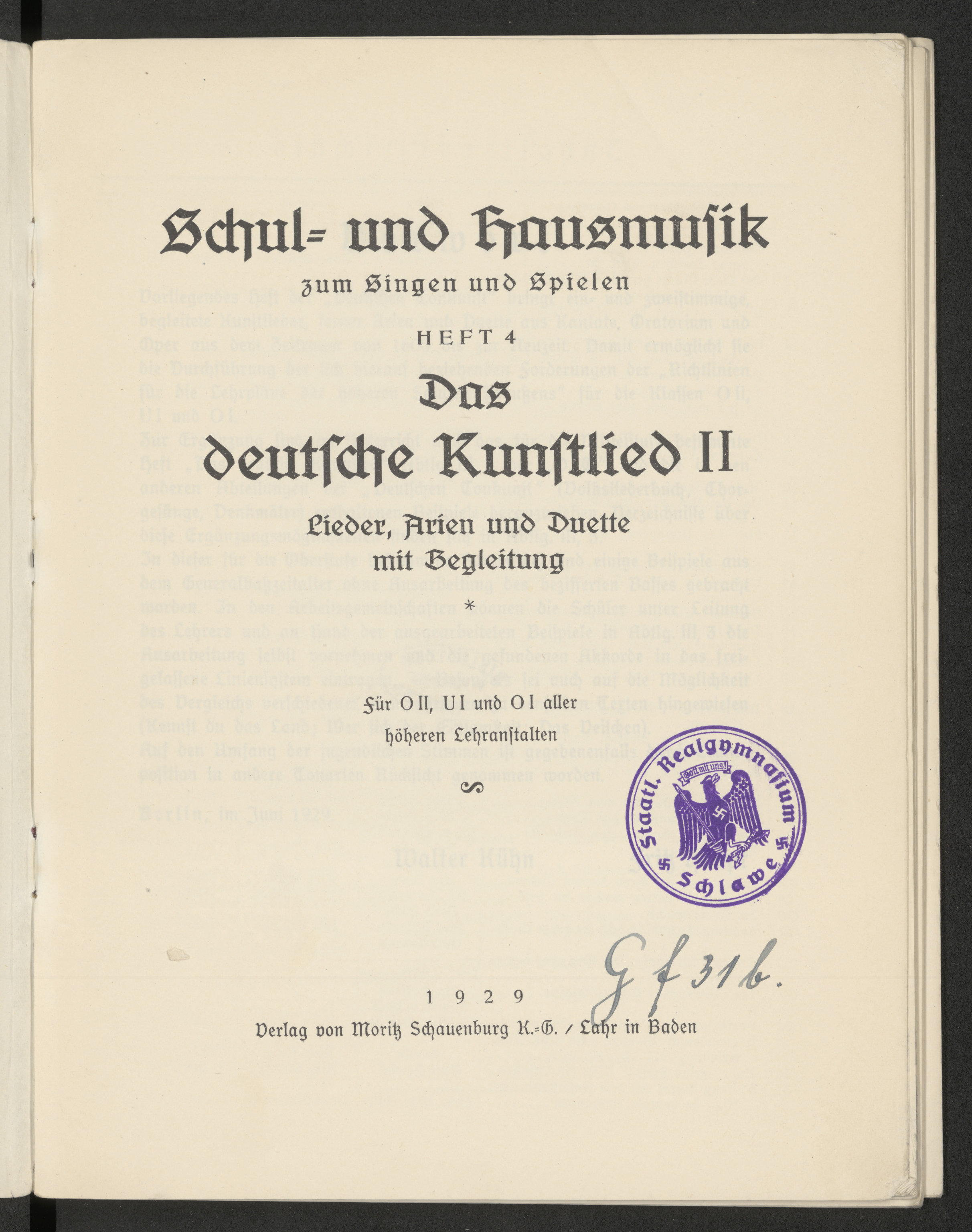 Deutsche Tonkunst, III. Schul und Hausmusik zum Singen und Spielen. H. 4 - strona tytułowa z pieczątką okrągłą: Staatl. Realgymnasium Schlawe