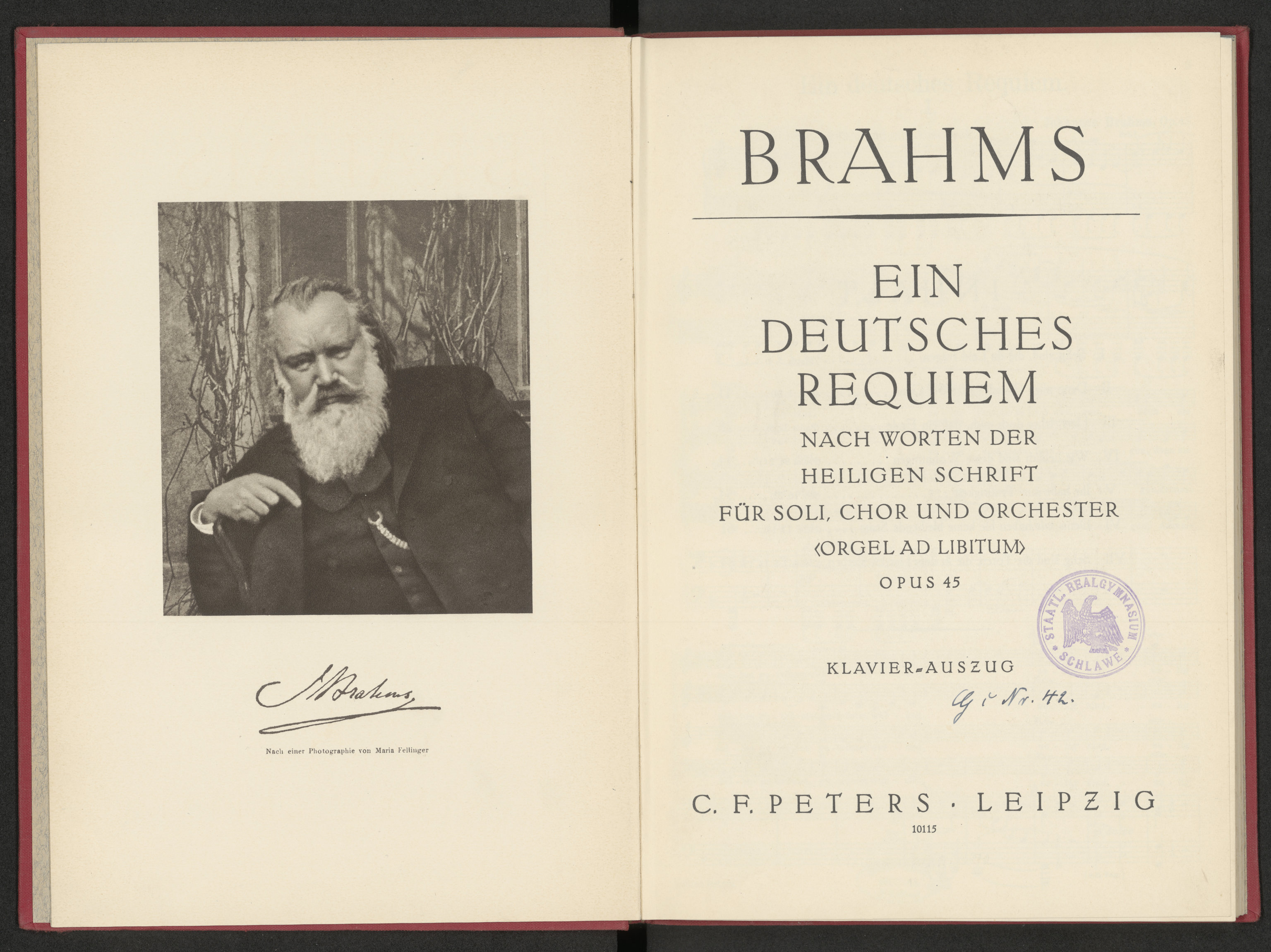 Ein deutsches Requiem : nach Worten der Heiligen Schrift für Soli, Chor und Orchester (Orgel ad libitum) : op. 45 - karta tytułowa z pieczątką: Staatl. Realgymnasium Schlawe i sąsiednia karta ze zdjeciem kompozytora