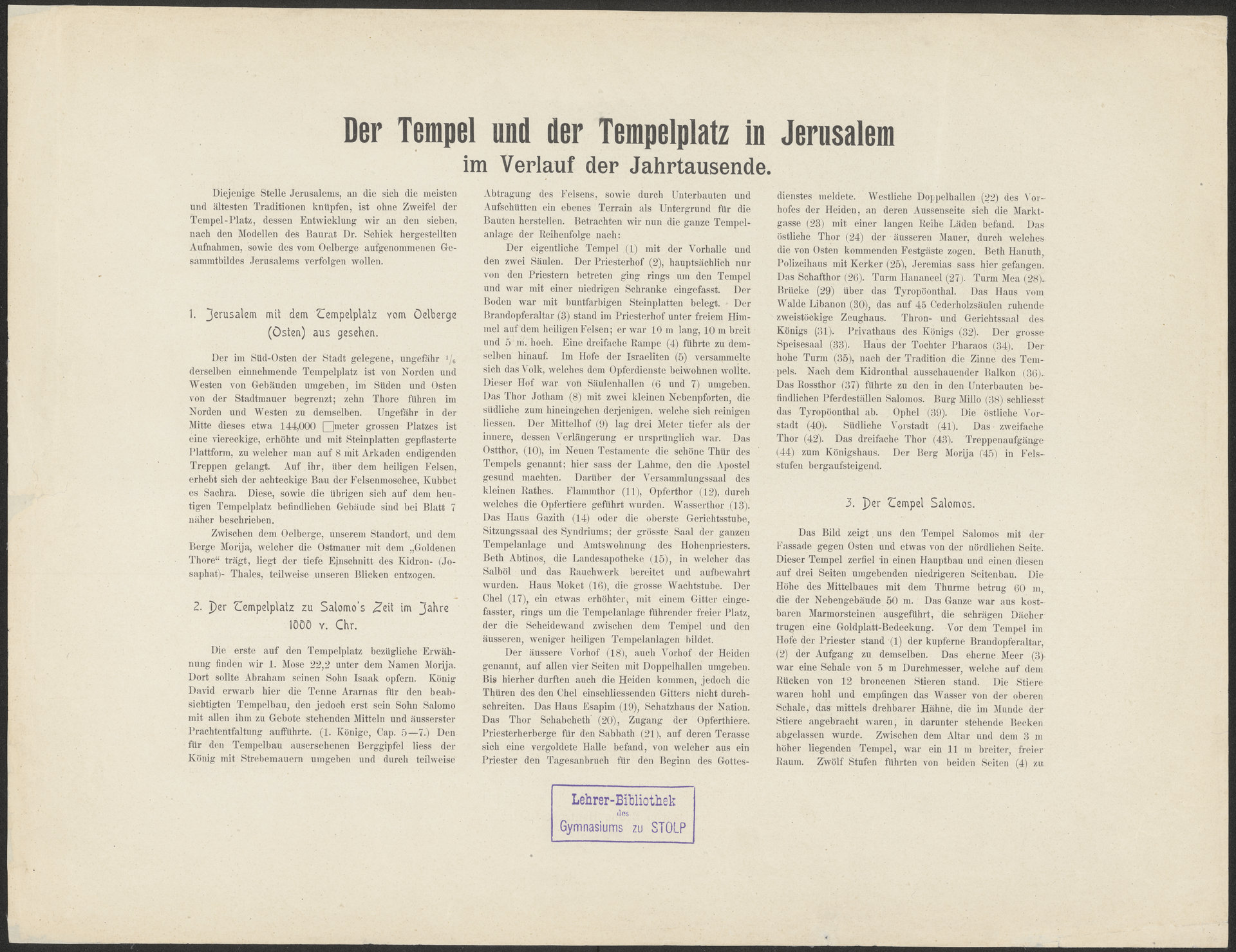 Der Tempel und der Tempelplatz in Jerusalem im Verlauf der Jahrtausende - strona tytułowa z pieczątką prostokątną Lehrer-Bibliothek des Gimnasiums zu STOLP