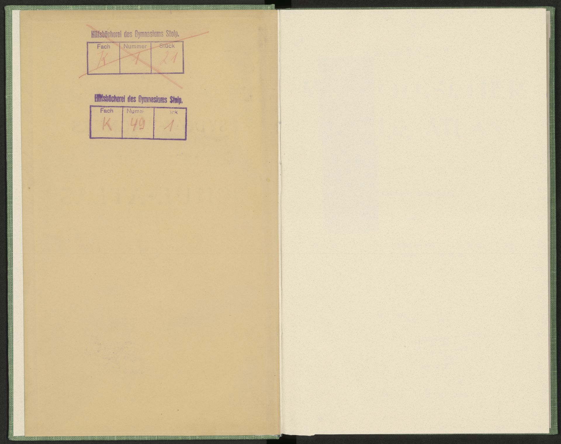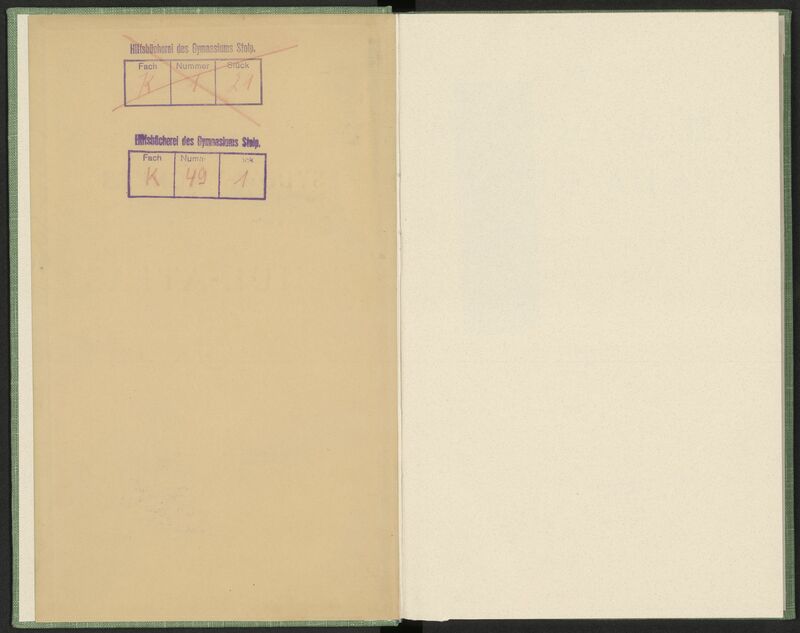 Sydow-Wagners Methodischer Schul-Atlas : 63 Haupt- und 51 Nebenkarten auf 47 Tafeln mit einem Namenverzeichnis / entworfen, bearb. und hrsg. von Hermann Wagner - wklejka górnej okładziny z fioletową pieczątką prostokątną: Hilfsbücherei des Gymnasiums Stolp