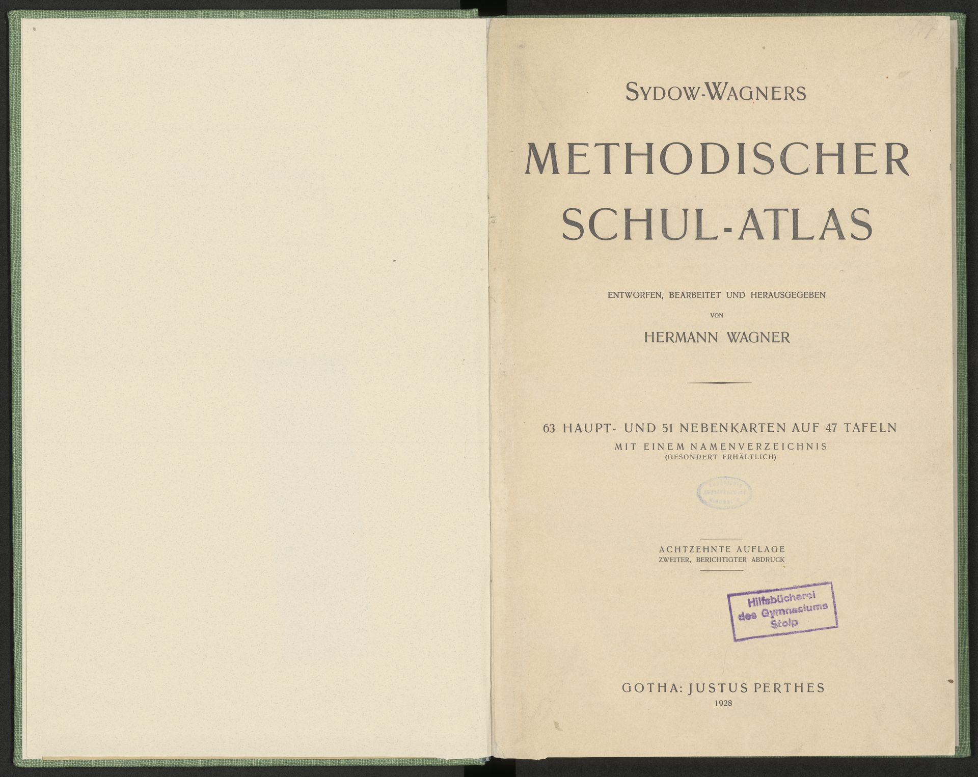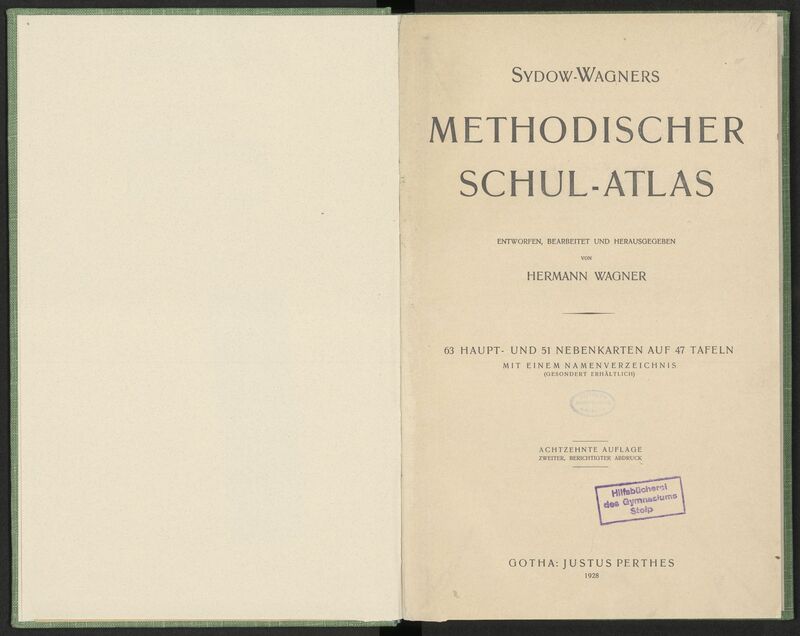 Sydow-Wagners Methodischer Schul-Atlas : 63 Haupt- und 51 Nebenkarten auf 47 Tafeln mit einem Namenverzeichnis / entworfen, bearb. und hrsg. von Hermann Wagner - strona tytułowa z fioletową prostokątną pieczątką: Hilfsbücherei des Gymnasiums Stolp