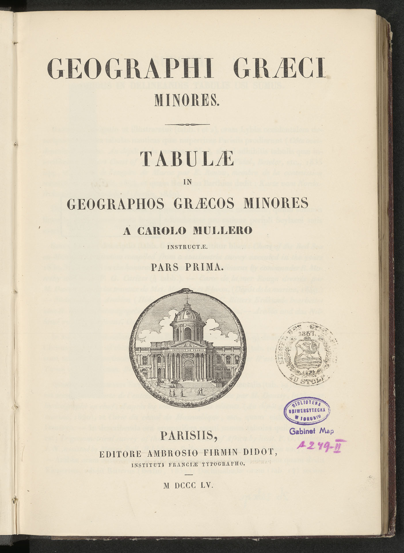 GEOGRAPHI GRAECI MINORES. TABULAE IN GEOGRAPHOS GRAECOS MINORES A CARLO MULLERO INSTRUCTAE. PARS PRIMA - strona tytułowa z okrągłą pieczątką: SIEGEL DES GYMNASIUMS ZU STOLP