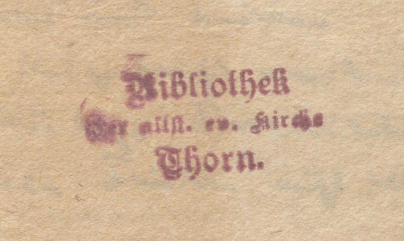 2. Pieczęć podłużna z napisem: „Bibliothek der altst. ev. Kirche Thorn”
