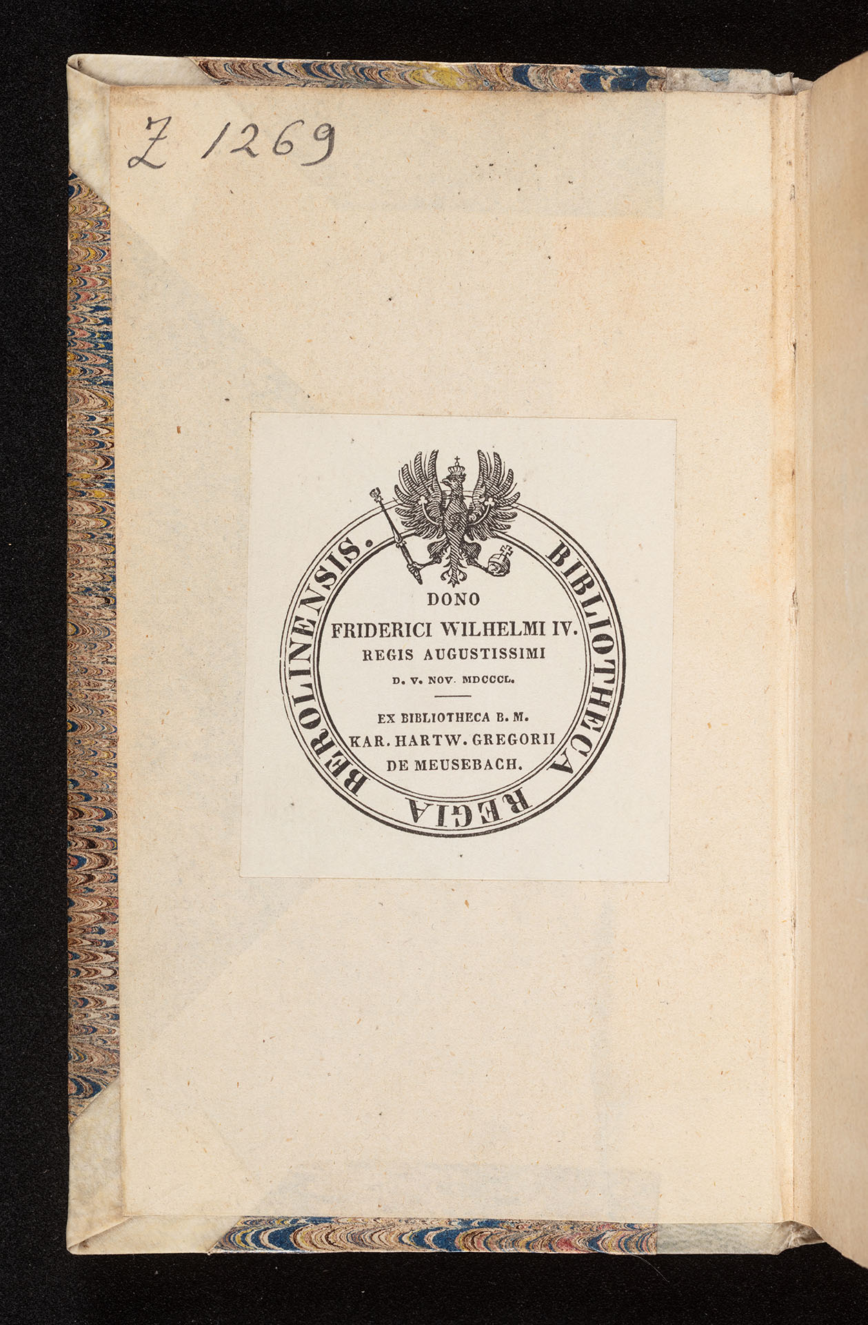 Der Clorinden Anderer Theil. Oder Liebs-Geschicht ... - ekslibris donacyjny „Bibliotheca Regia Berolinensis. Dono Friderici Wilhelmi IV Regis Augustissimi D. V. Nov. MDCCCL. Ex Bibliotheca B. M. Hartw. Gregorii De Meusebach.”; sygnatura (ołówek) Z 1269