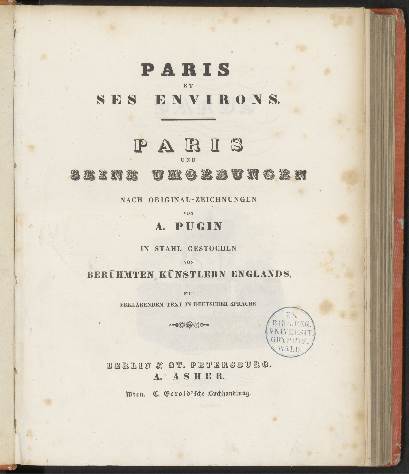 Paris Et Ses Environs : = Paris und Seine Umgebungen : Mit Erkärendem Text In Deutscher Sprache - strona tytułowa z pieczątką: Ex. Bibl. Reg.Universit. Gryphis-Wald