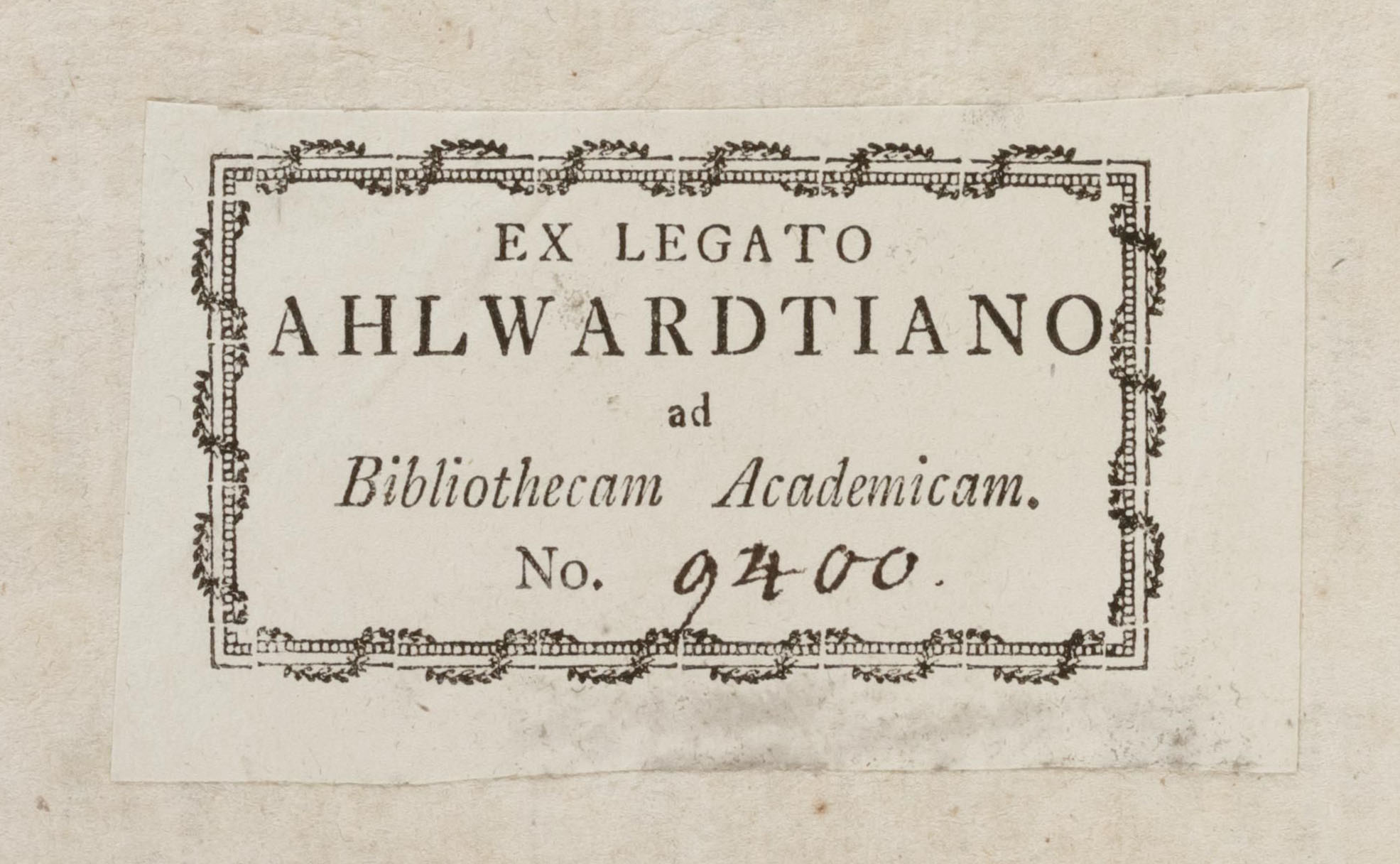 Vita Jacobi Henrici Zerneckii, Præconsulis Thoruniensis - exlibris donacyjny: Ex legato ahlwardtiano ad Bibliothecam Academicam. No. 9400.