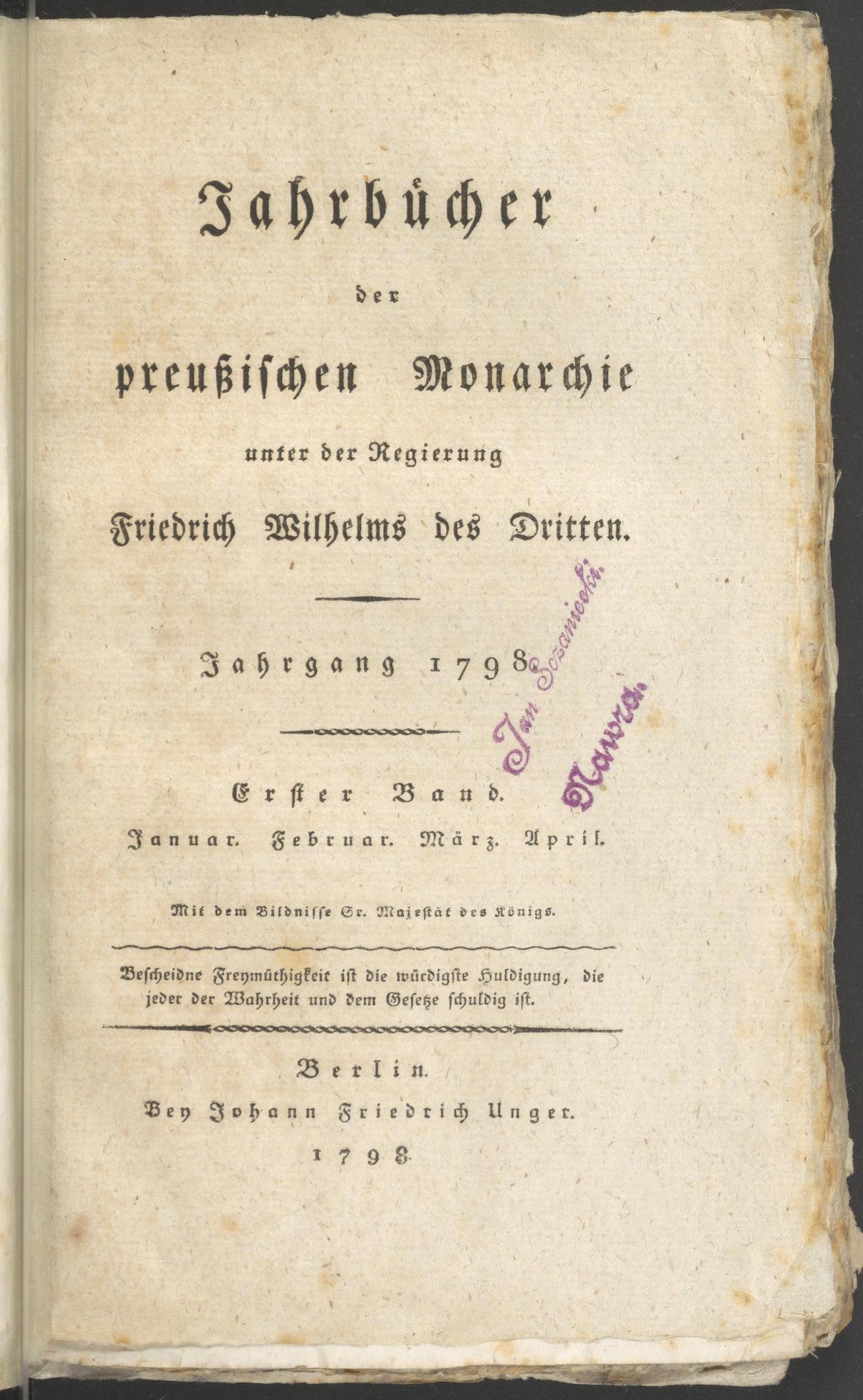 Part of Jahrbücher der preußischen Monarchie unter der Regierung Friedrich Wilhelms des Dritten; Jg. 1798 Bd. 1 Januar