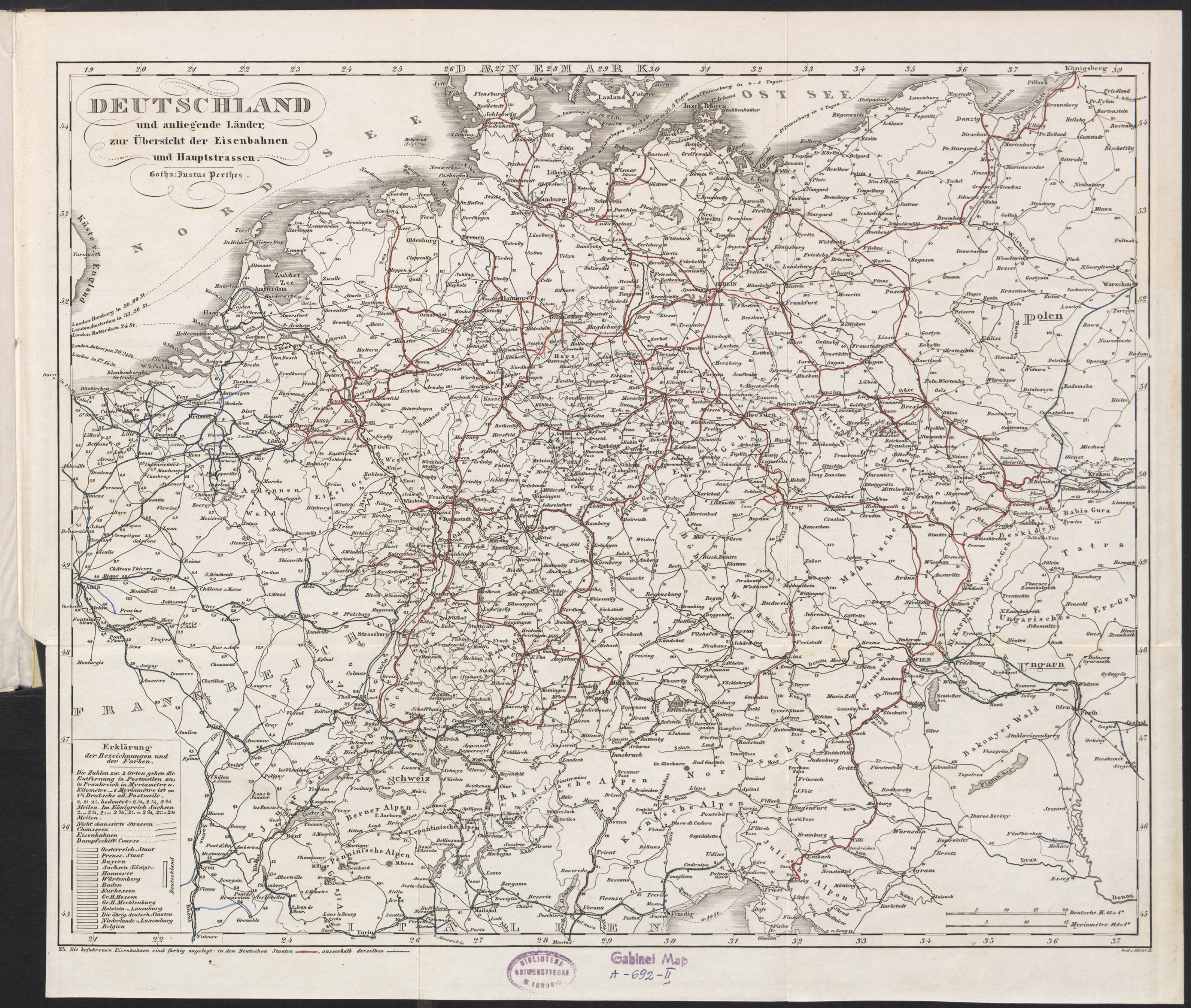 Part of Eisenbahn-Atlas von Deutschland, Belgien, Elsass und dem nördlichsten Theile von Italien : in 16 Specialkarten auf 13 Blättern, nebst einer Uebersichtskarte