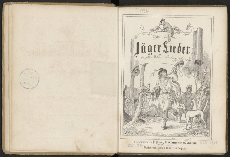 Part of 150 alte und neue Jäger-, Soldaten- und Volkslieder mit Bildern und Singweisen. 56 Jägerlieder, 35 Soldatenlieder, 59 Volkslieder