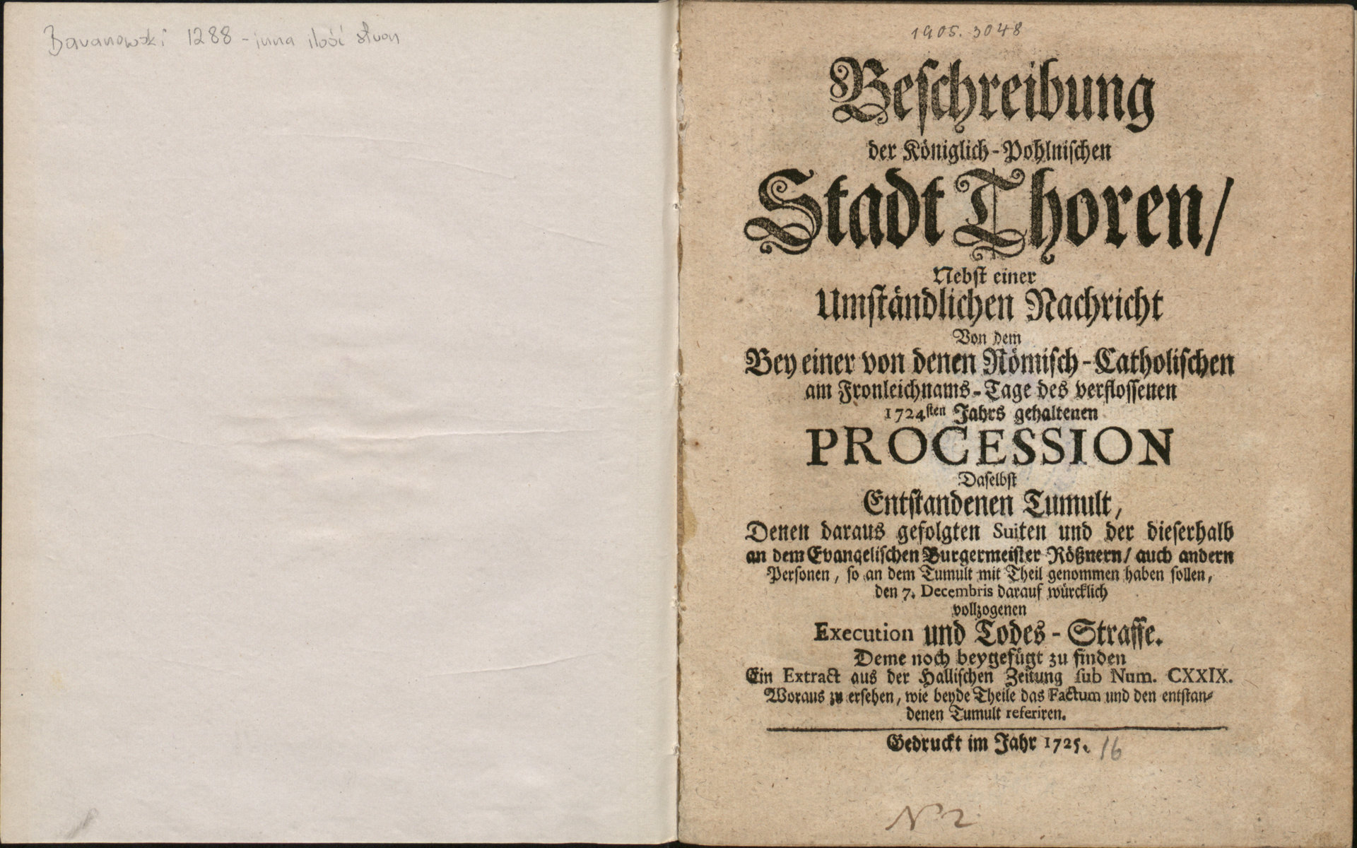 Part of Beschreibung der Königlich-Pohlnischen Stadt Thoren, Nebst einer Umständlichen Nachricht Von dem Bey einer von denen Römisch-Catholischen am Fronleichnams-Tage des verflossenen 1724sten Jahrs gehaltenen Procession Daselbst Entstandenen Tumult, Denen daraus gefolgten Suiten und der dieserhalb an dem Evangelischen Burgermeister Rößnern, auch andern Personen, so an dem Tumult mit Theil genommen haben sollen, den 7. Decembris darauf würcklich vollzogenen Execution und Todes-Straffe