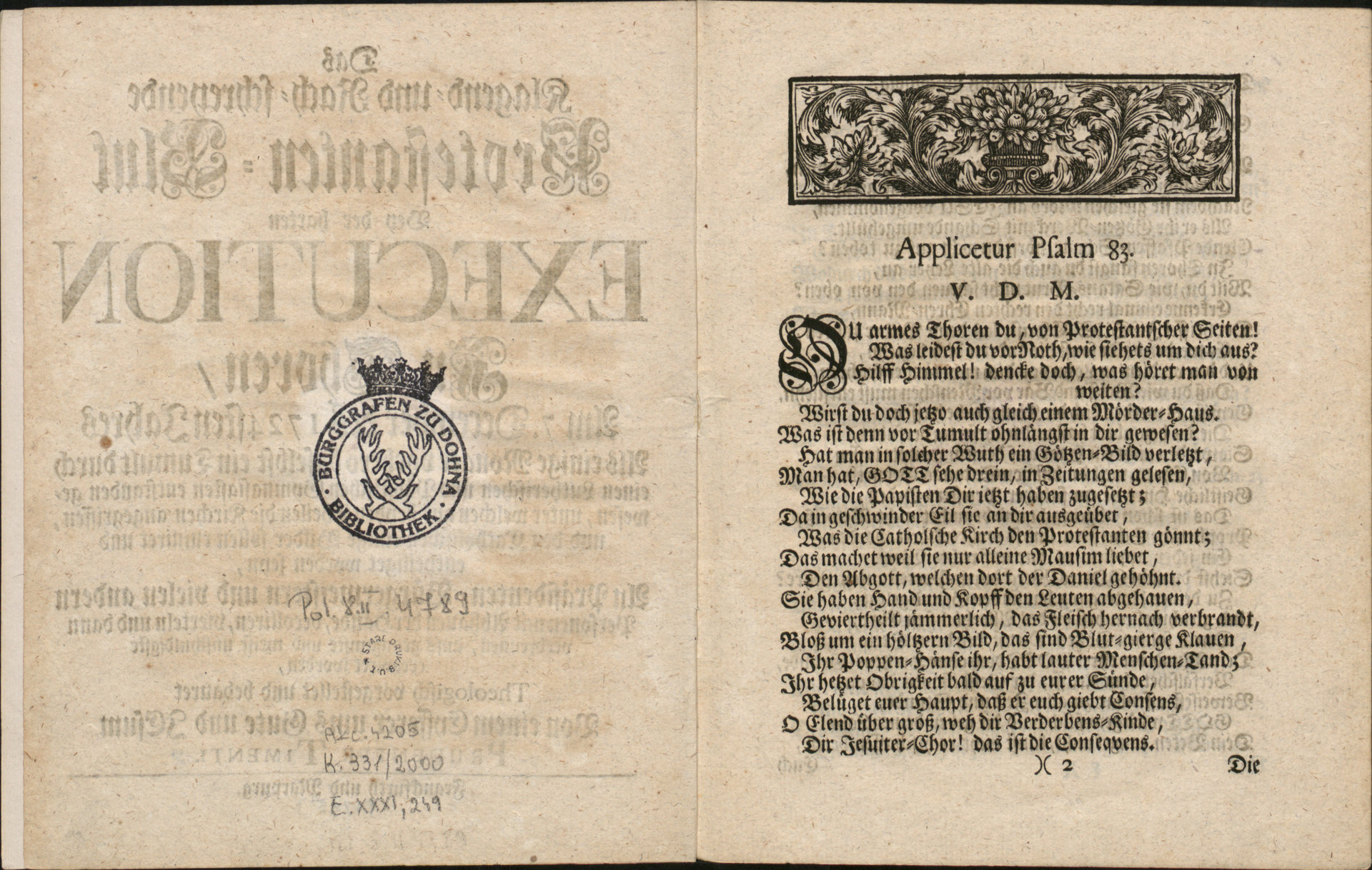 Das Klagend- und Rach-schreyende Protestanten-Blut... - verso karty tytułowej z pieczątką