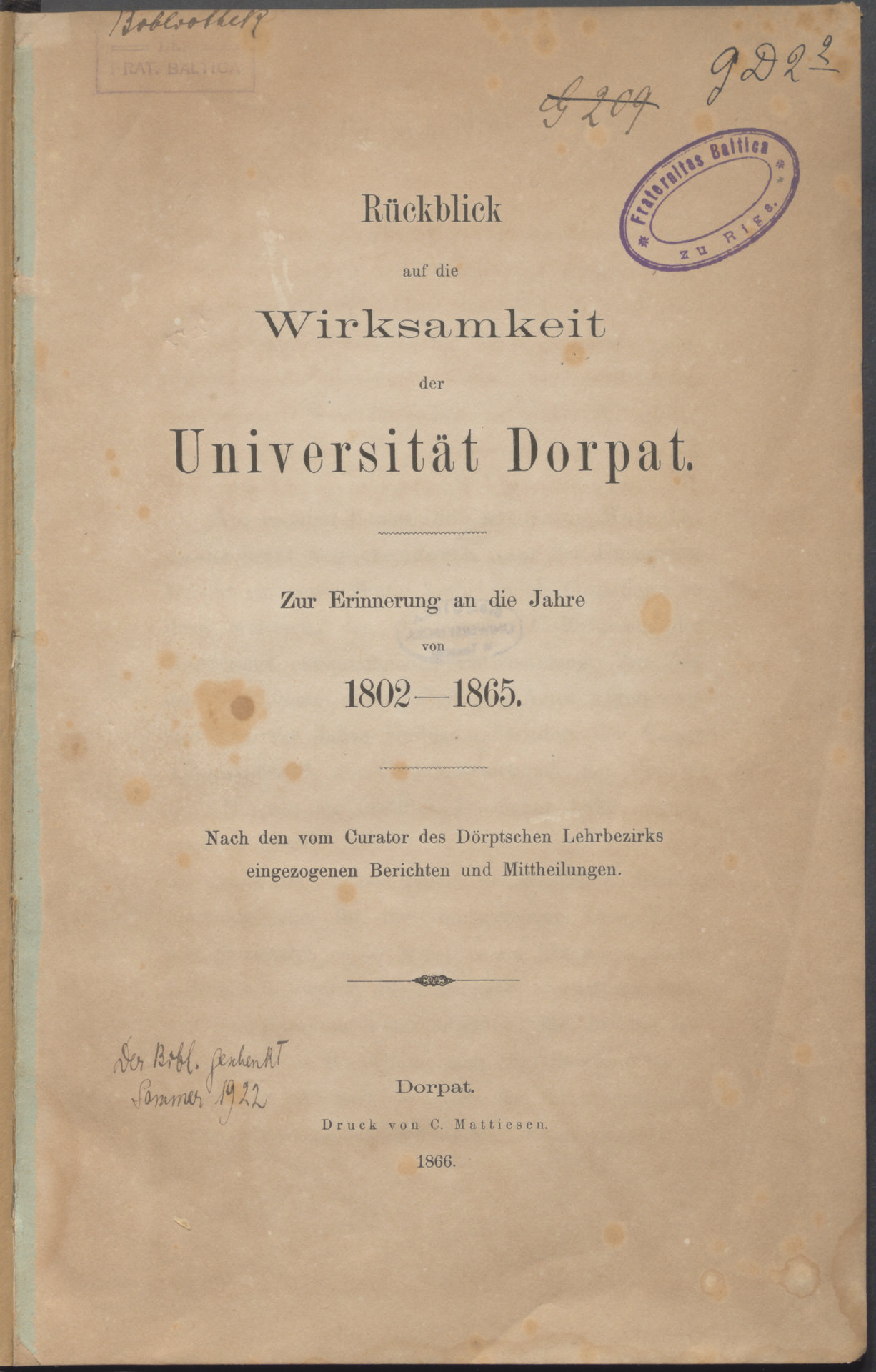 Part of Rückblick auf die Wirksamkeit der Universität Dorpat : zur Erinnerung an die Jahre von 1802 - 1865 ; nach den vom Curator des Döptschen Lehrbezirks ingezogenen Berichten und Mittheilungen