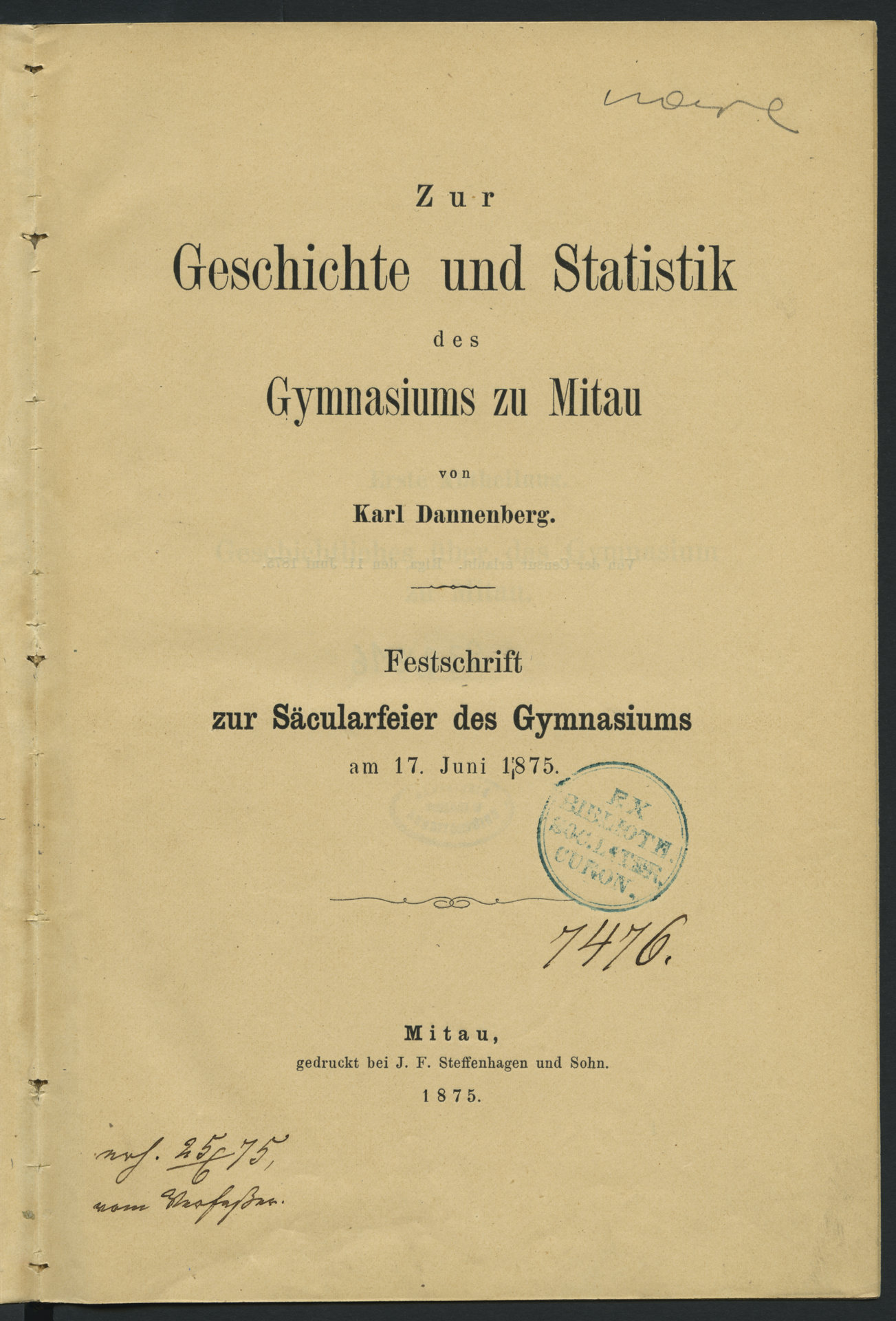Part of Zur Geschichte und Statistik des Gymnasiums zu Mitau : Festschrift zur Säcularfeier des Gymnasiums am 17. Juni 1875