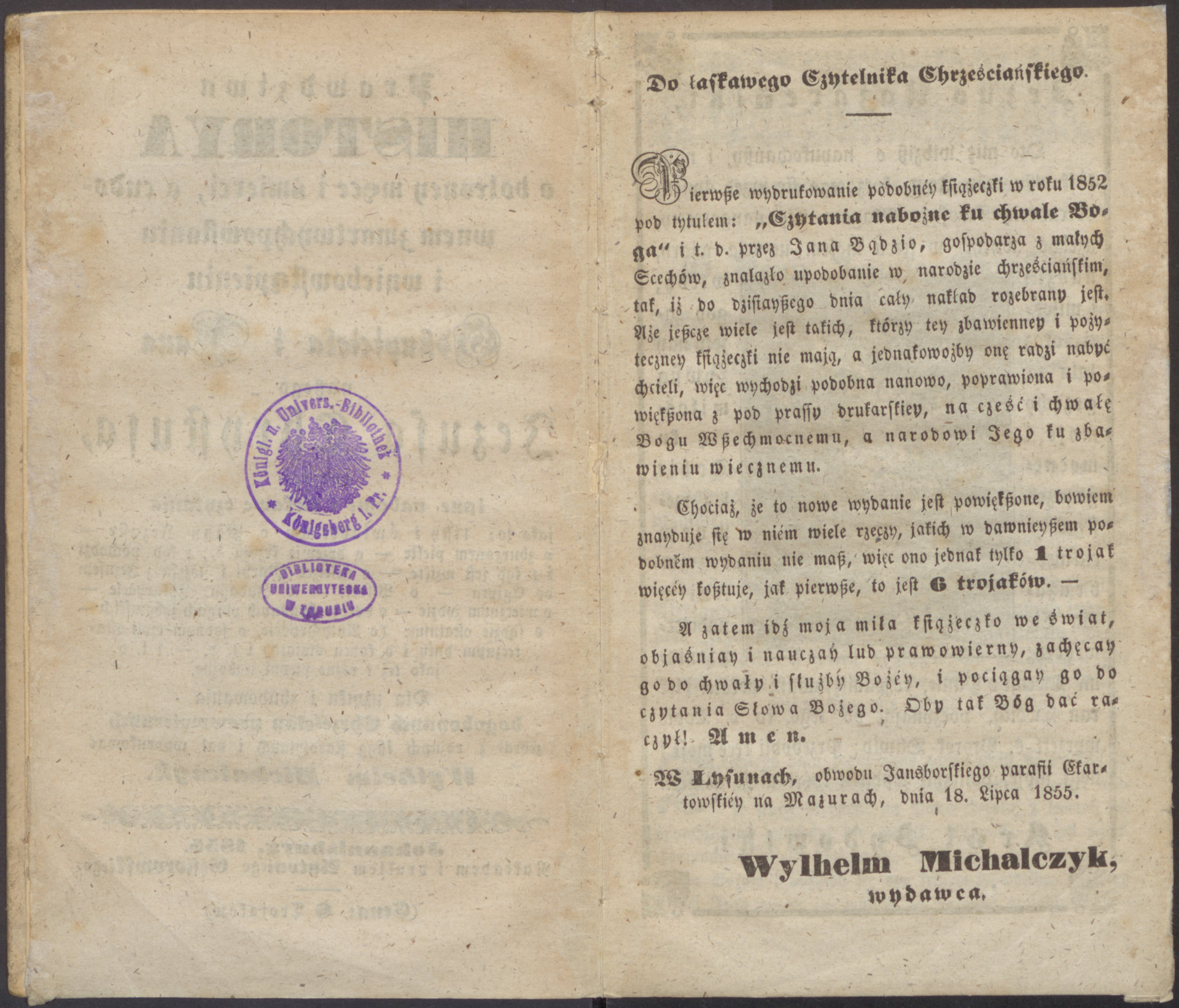 Prawdziwa historya o bolesney męce i śmierci, o cudownem zmartwychpowstaniu i wniebowstąpieniu Odkupiciela i Pana naszego Jezusa Chrystusa tudzież inne nabożne i ciekawe czytania (...) dla użytku i zbudowania bogoboynych chrześcijan prawowiernych - strona tytułowa verso z pieczątkami