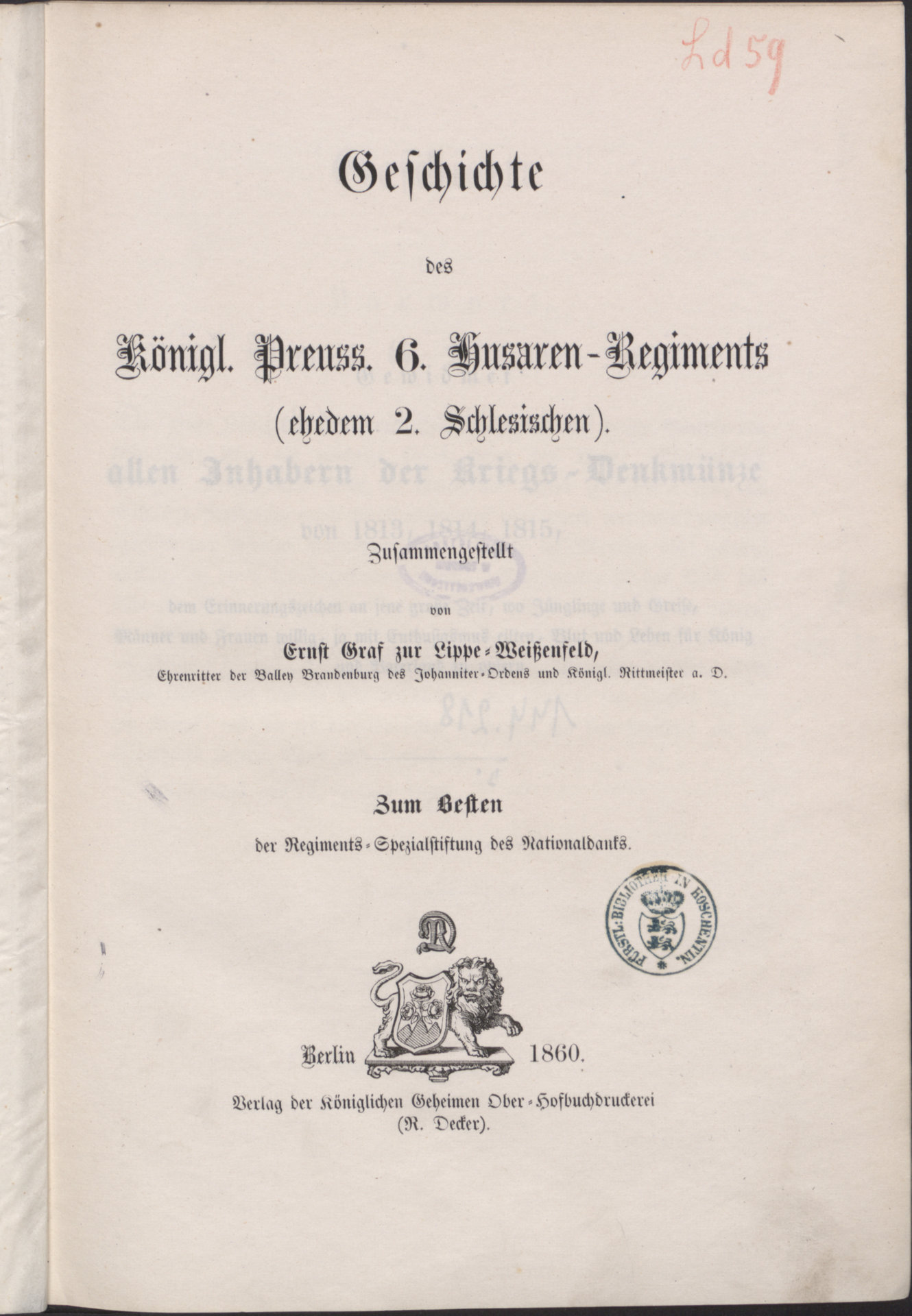 Geschichte des Königl. Preuss. 6. Husaren-Regiments (ehedem 2. Schlesischen) - strona tytułowa