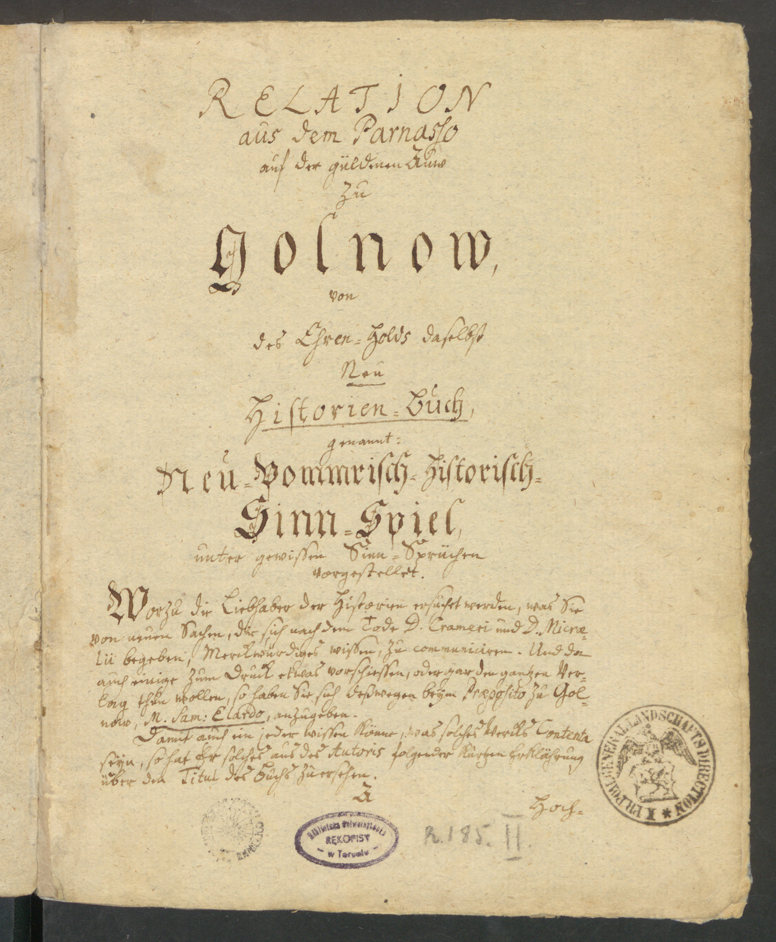 Part of Relation aus dem Parnasso auf der güldenen auw zu Golnow von des Ehren-Holds daselbst neu Historien-Buch, genannt Neu-Pommrisch-Historisch-Sinn-Spiel, unter gewissen Sinn-Sprüchen vorgestellt...