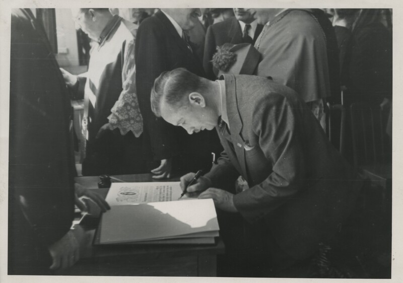 Uroczyste otwarcie Biblioteki Uniwersyteckiej w Toruniu, 10 maja 1947 r., podpisanie księgi pamiątkowej