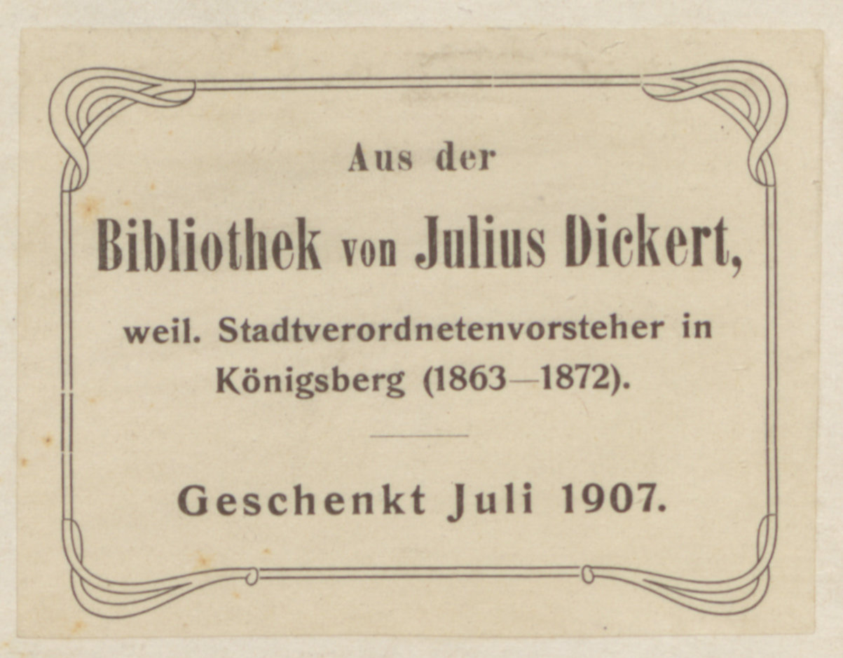Russische Wandlungen : neue Beiträge zur russischen Geschichte von Nikolaus I. zu Alexander III - nalepka informująca o pochodzeniu egz. z biblioteki Juliusa Dickerta (1816-1896), niemieckiego polityka: Aus der Bibliothek von Julius Dickert, weil. Stadtverordnetenvorstehr in Köigsberg (1863-1872). Geschenkt Juli 1907.