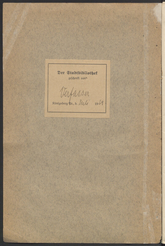 Von den Badern, Barbieren und Perückenmachern in Königsberg : Ein Beitrag zur Geschichte des Königsberger Zunftwesens - okładka verso z nalepką donacyjną: Der Stadtbibliothek geschenkt von Verfasser, Köigsberg Pr., d. Juli 1924.