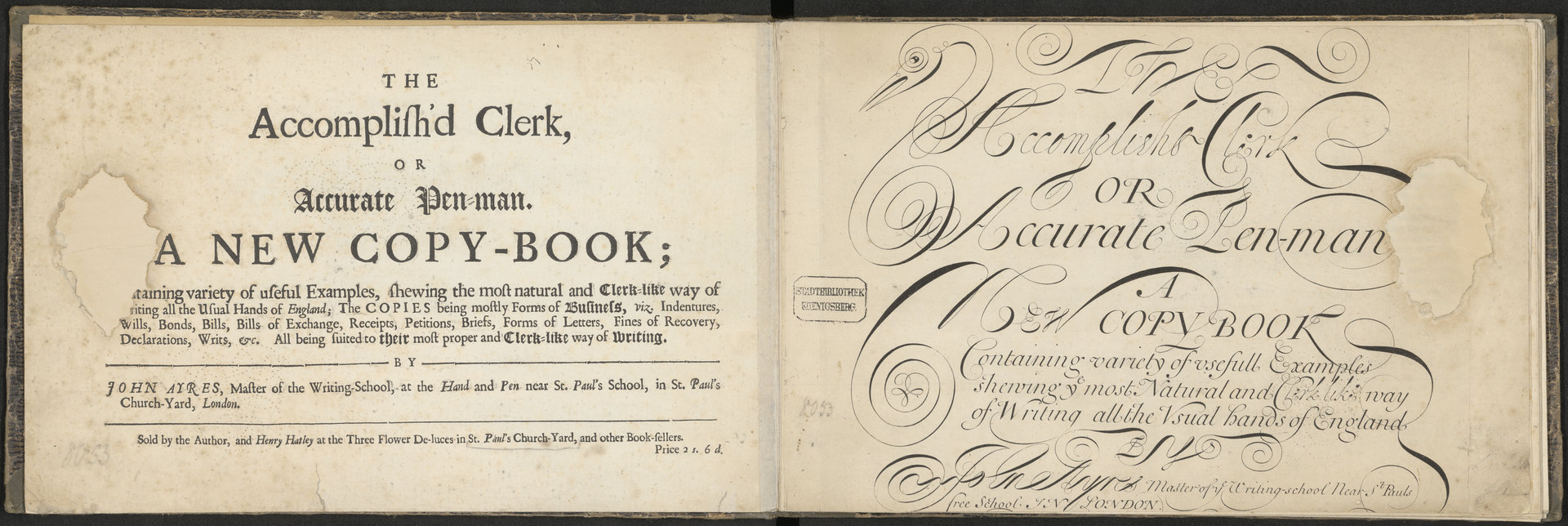 The accomplished clerk, or, Accurate penman a new copy book containing variety of usefull examples showing ye most natural and clerk like way of writing all the usual hands of England - strona tytułowa i przytytułowa z pieczątką