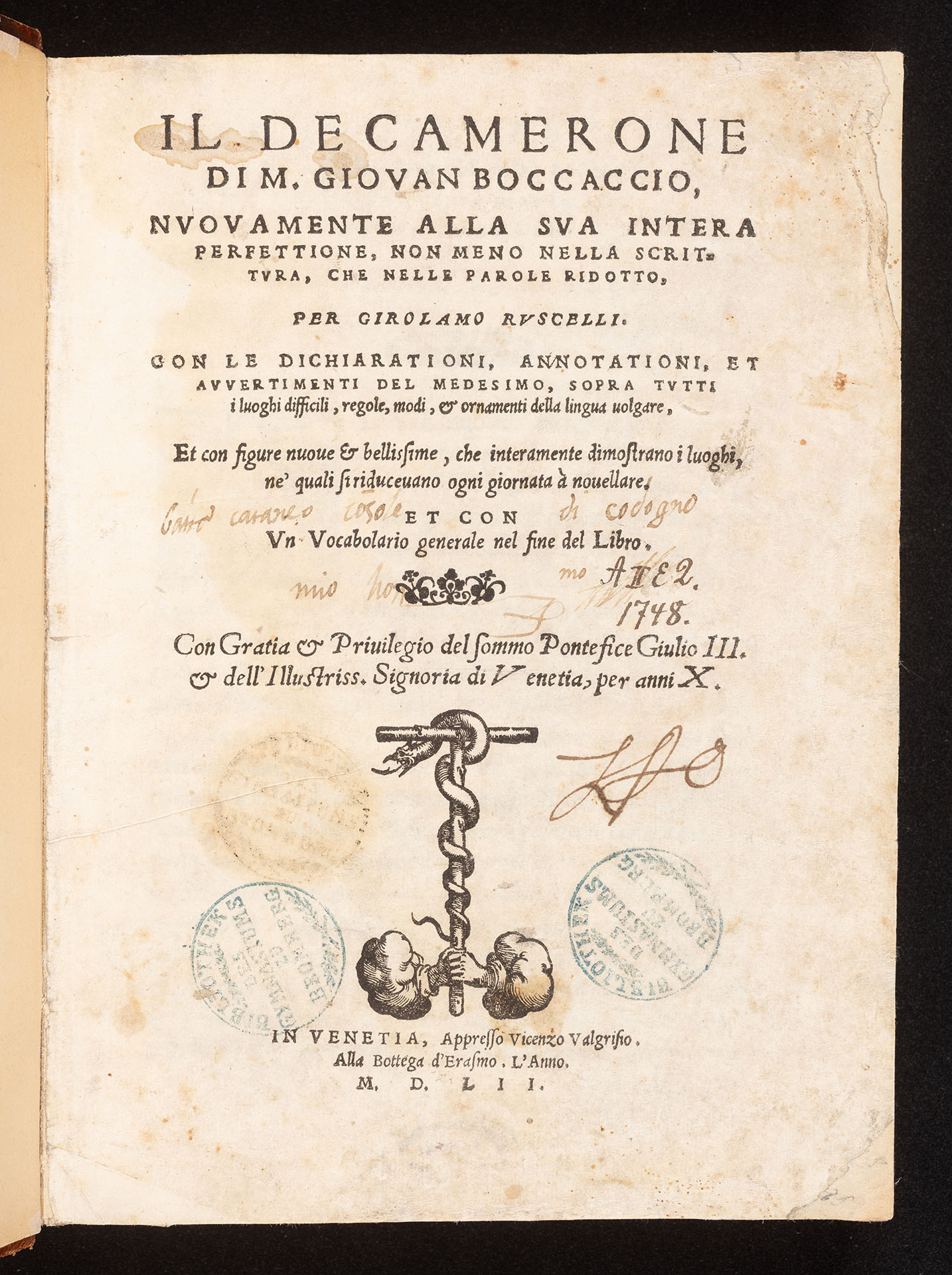 Il Decamerone Di M. Giovan Boccaccio ... - strona tytułowa z pieczątkami i sygnaturą: A I ε 2. 1748.